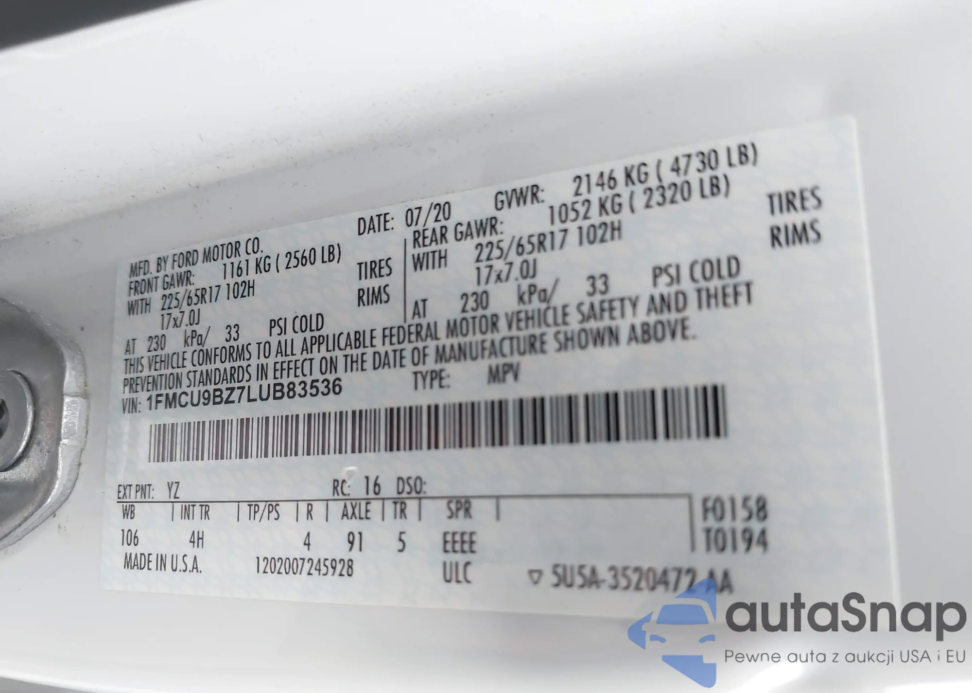 LOT: 43703871 VIN: 1FMCU9BZ7LUB83536