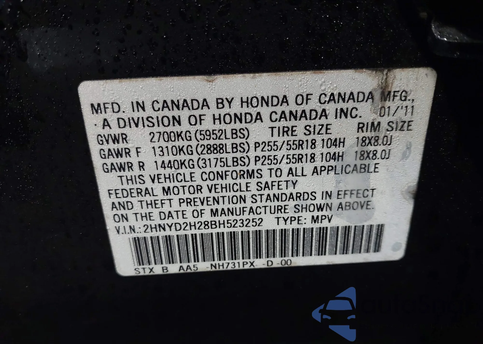 • VIN 2HNYD2H28BH523252
