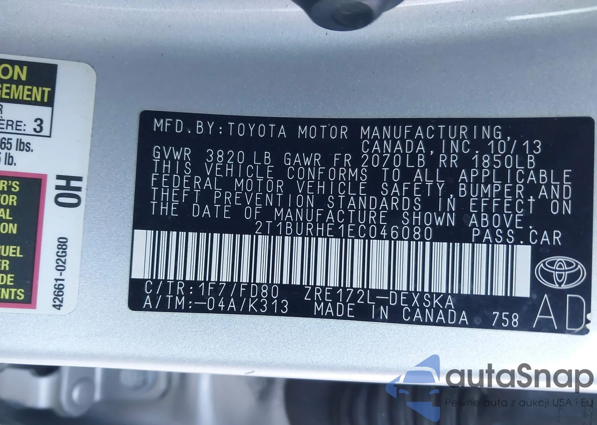 LOT: 43920030 VIN: 2T1BURHE1EC046080