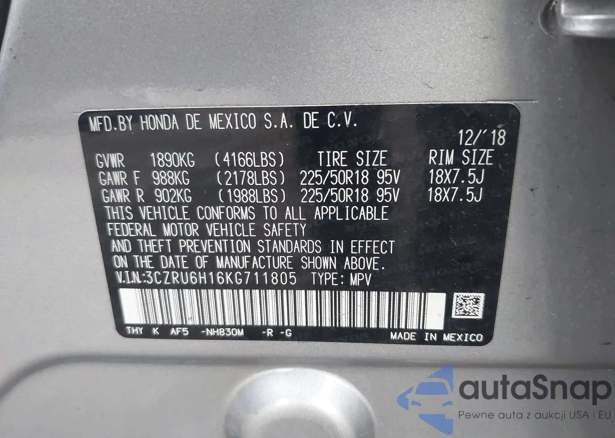 • VIN 5FNYF6H39NB067658