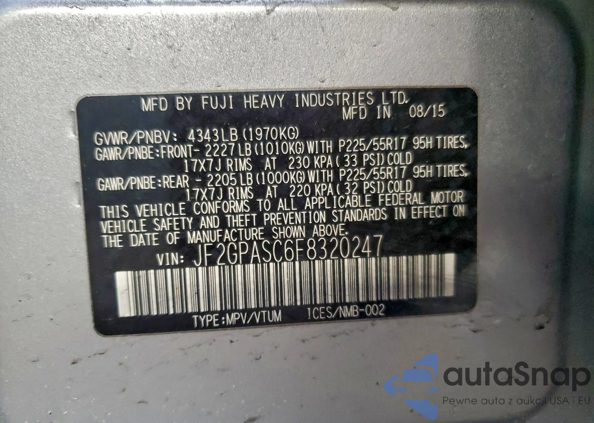 LOT: 93104835 VIN: JF2SH6DC5AH748580