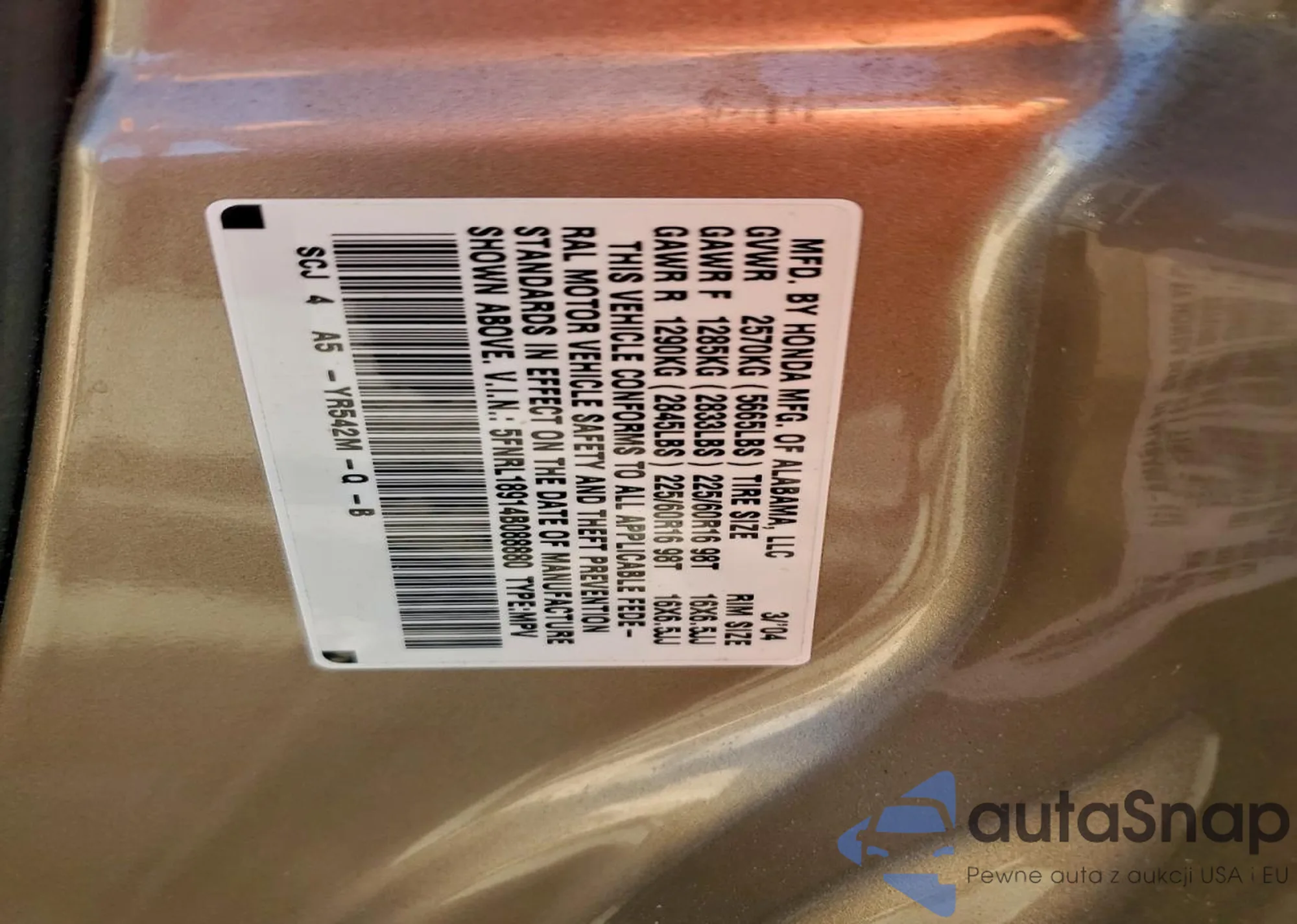 LOT: 96765105 VIN: 5FNRL18914B088880