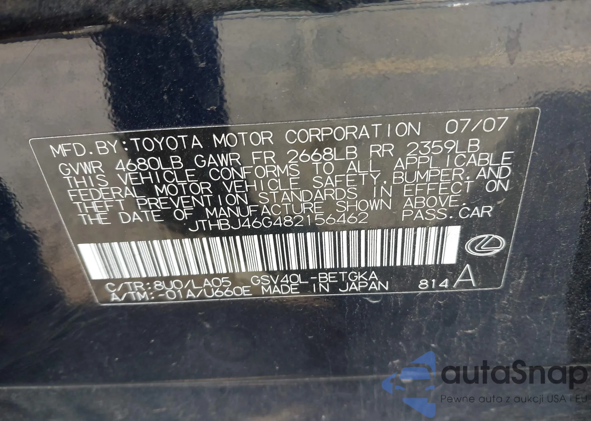 LOT: 43774752 VIN: JTHBJ46G482156462