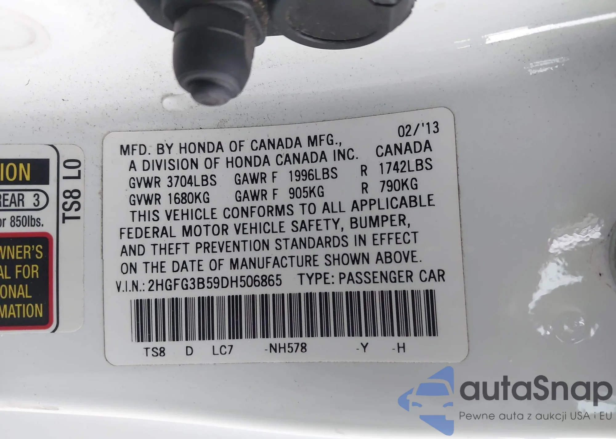 LOT: 43908210 VIN: 2HGFG3B59DH506865