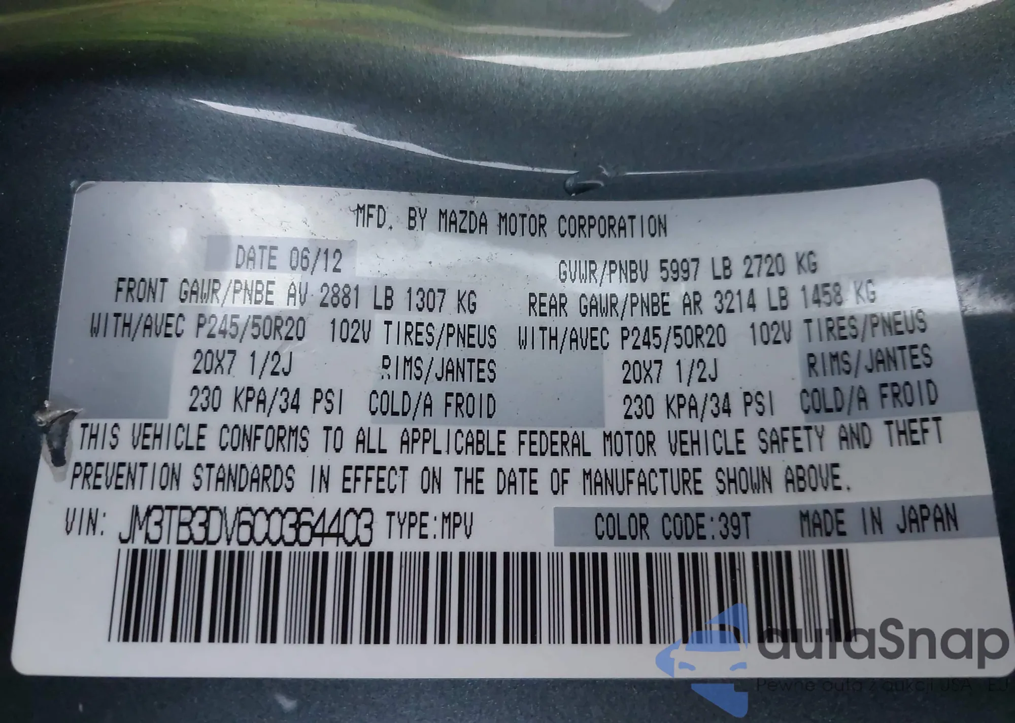 • VIN JM3TB3DV6C0364403