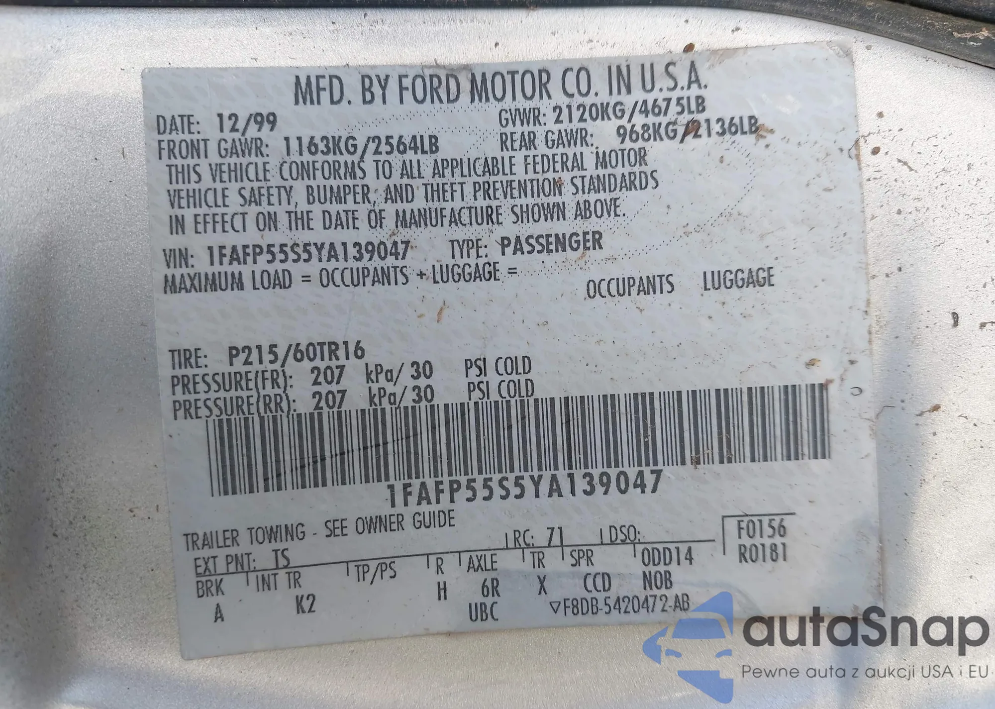LOT: 43899558 VIN: 1FAFP55S5YA139047