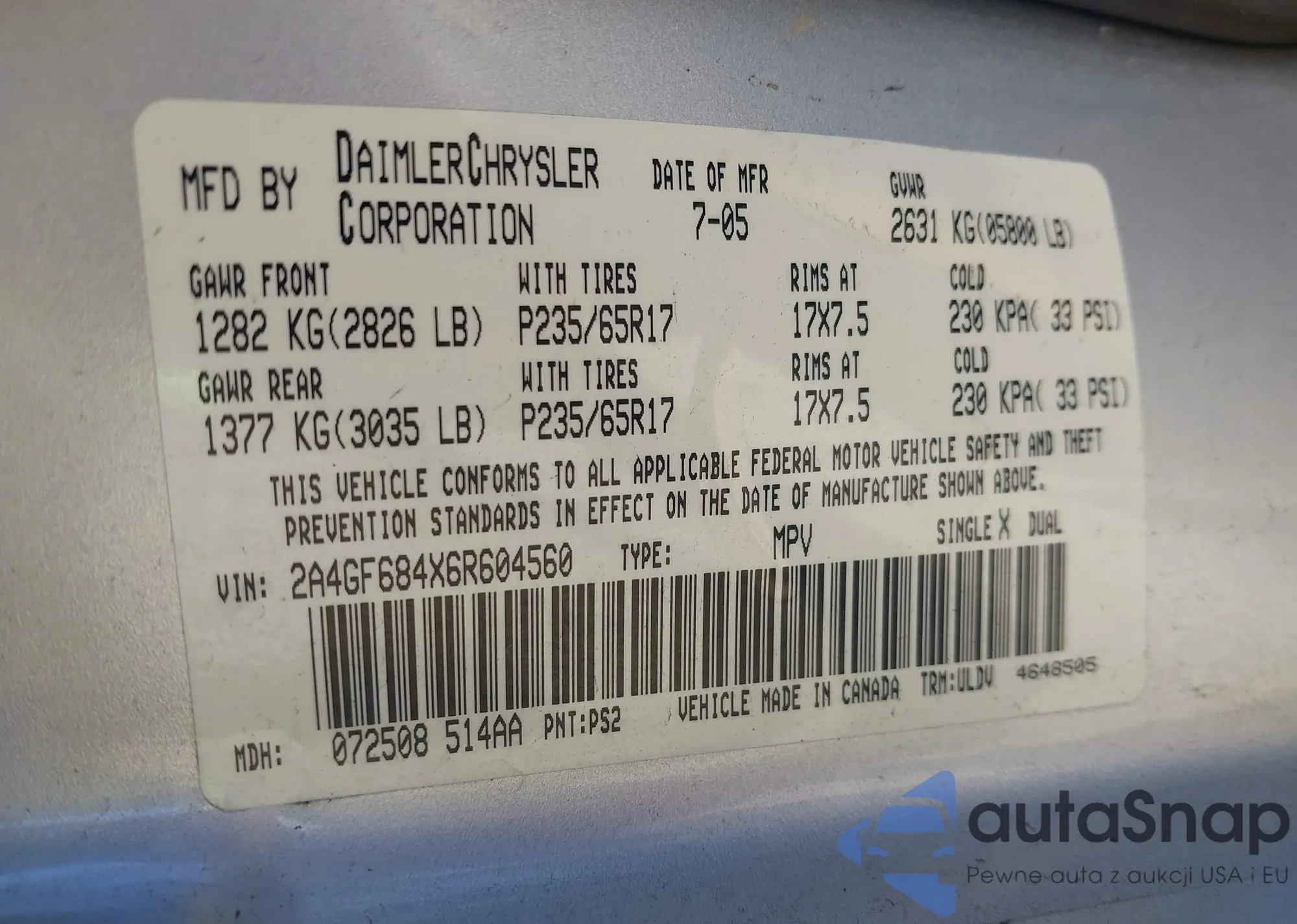 • VIN 2A4GF684X6R604560