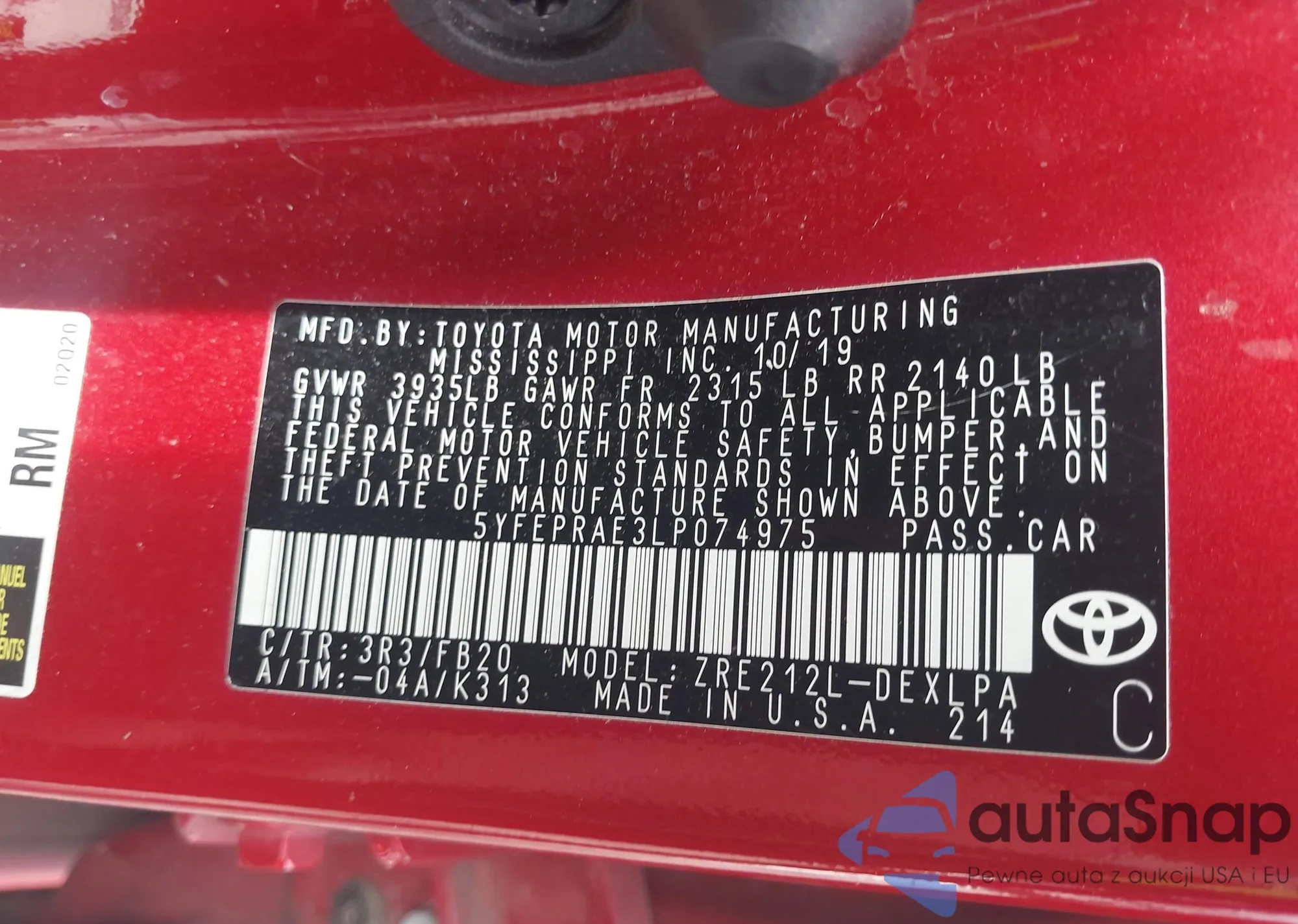 • VIN 5YFEPRAE3LP074975