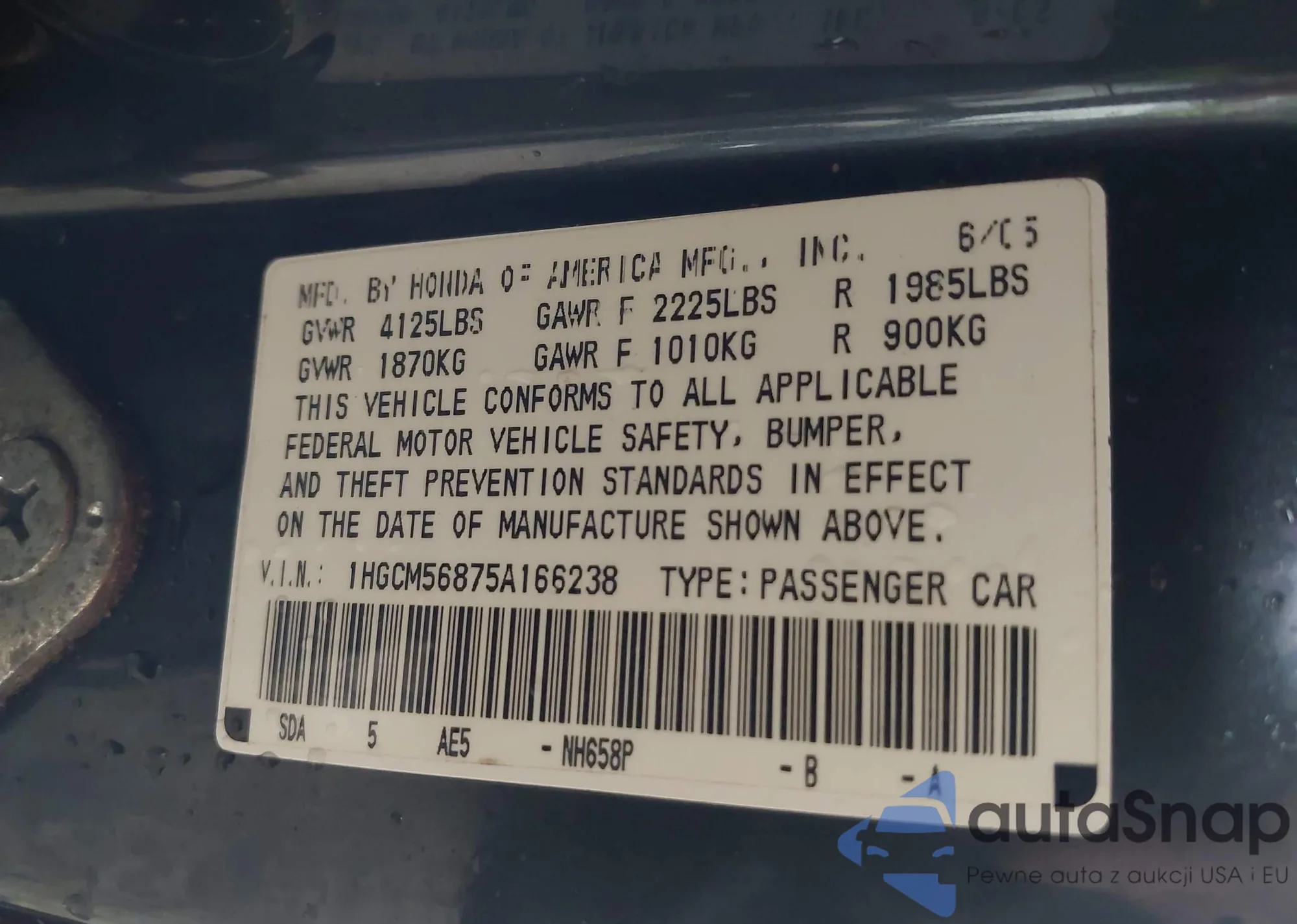 LOT: 43868715 VIN: 1HGCM56875A166238