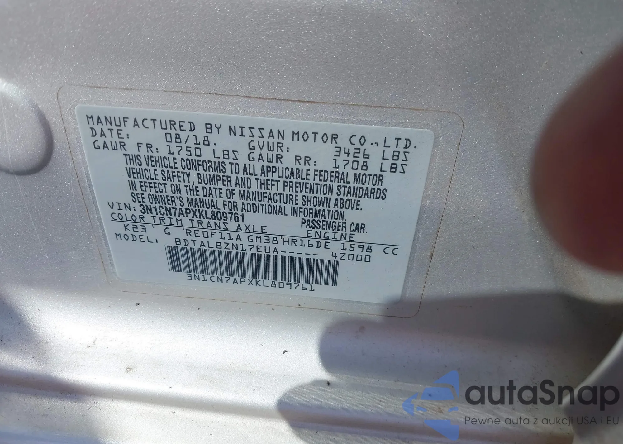 • VIN 3N1CN7APXKL809761