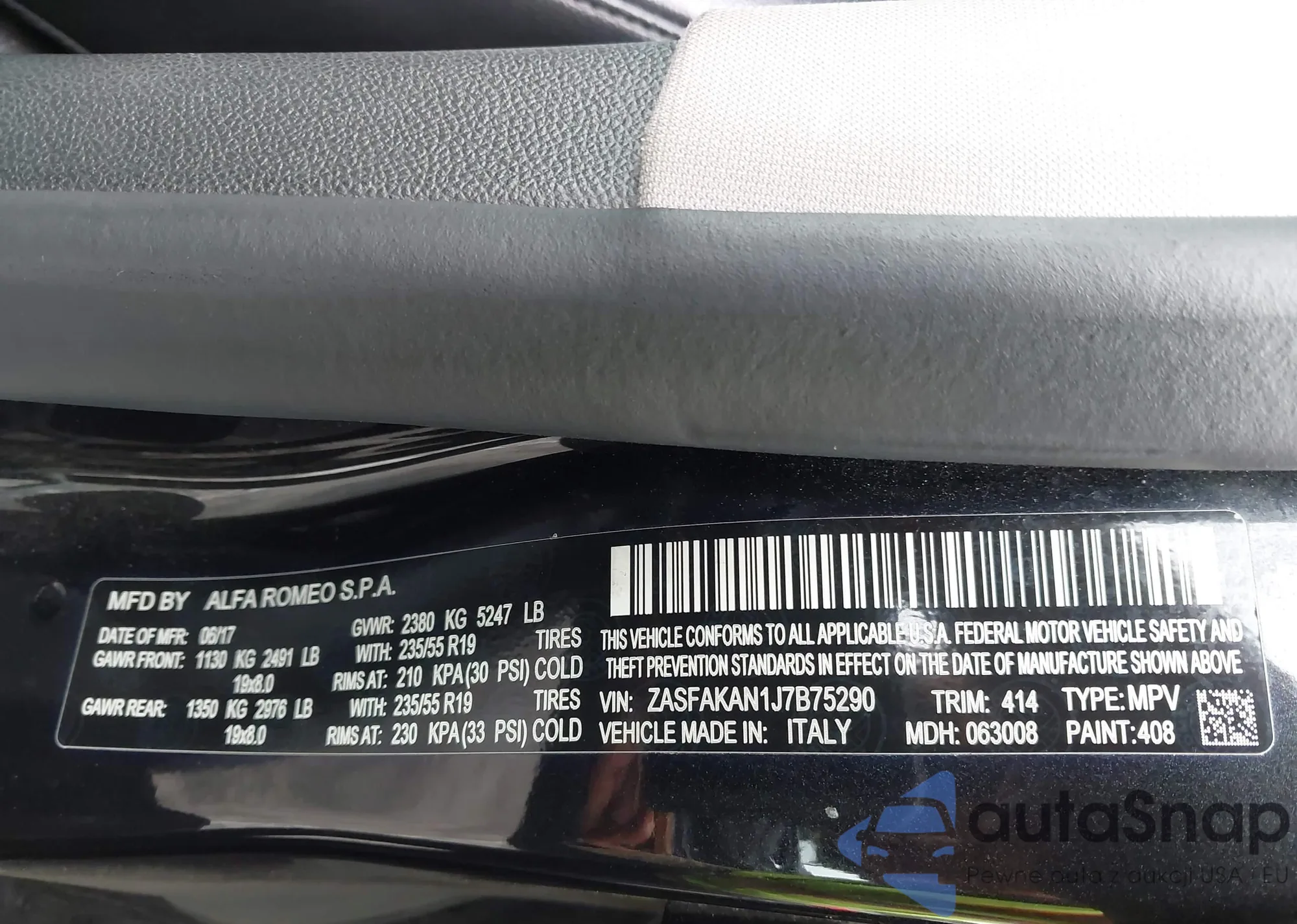 LOT: 43436595 VIN: ZASFAKAN1J7B75290