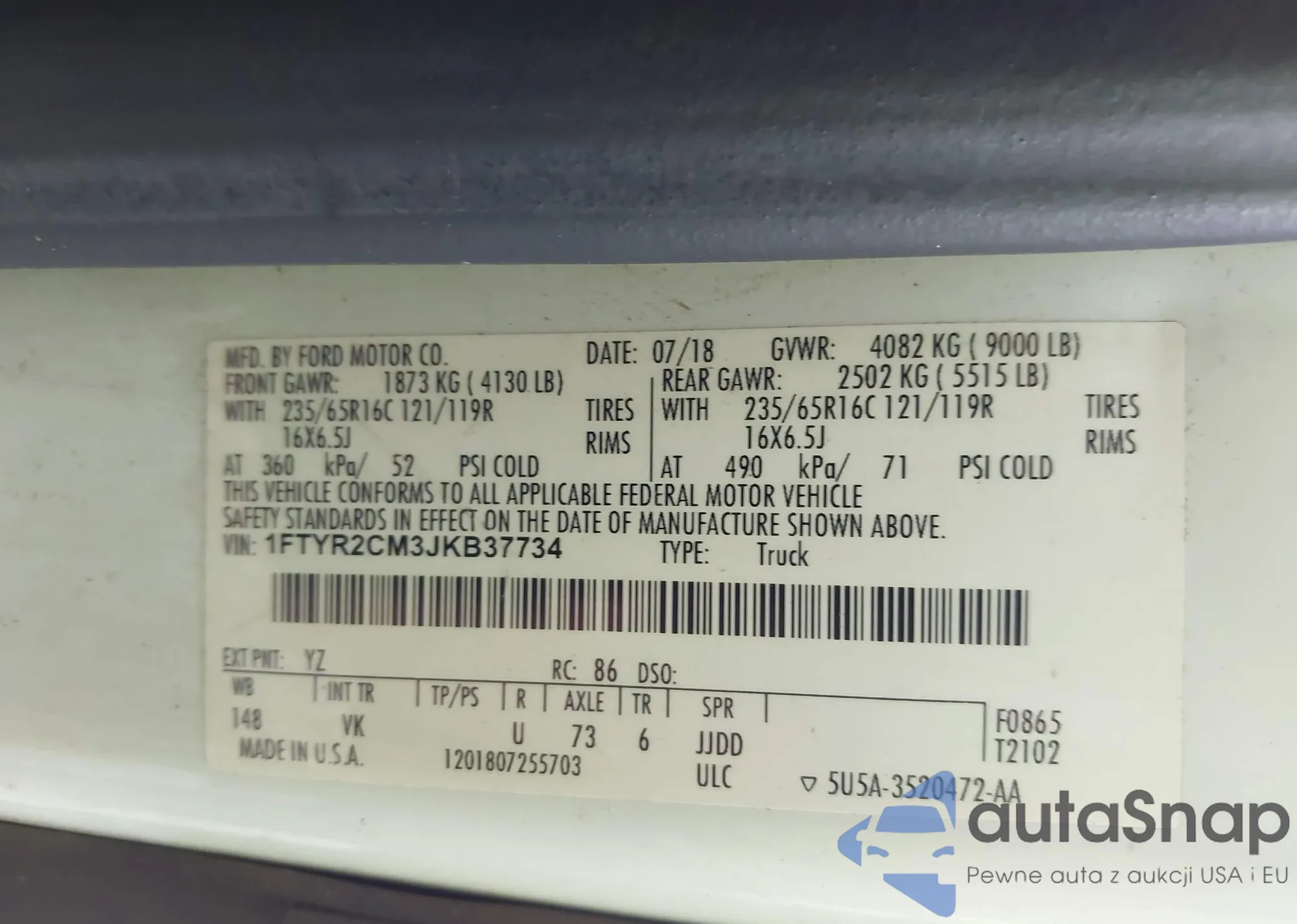 • VIN 1FTYR2CM3JKB37734