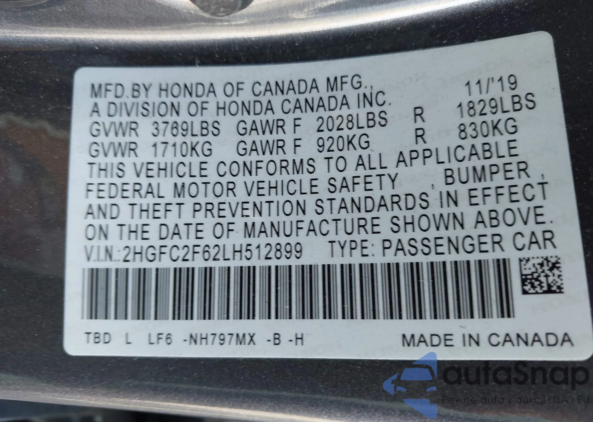 • VIN 2HGFC2F62LH512899