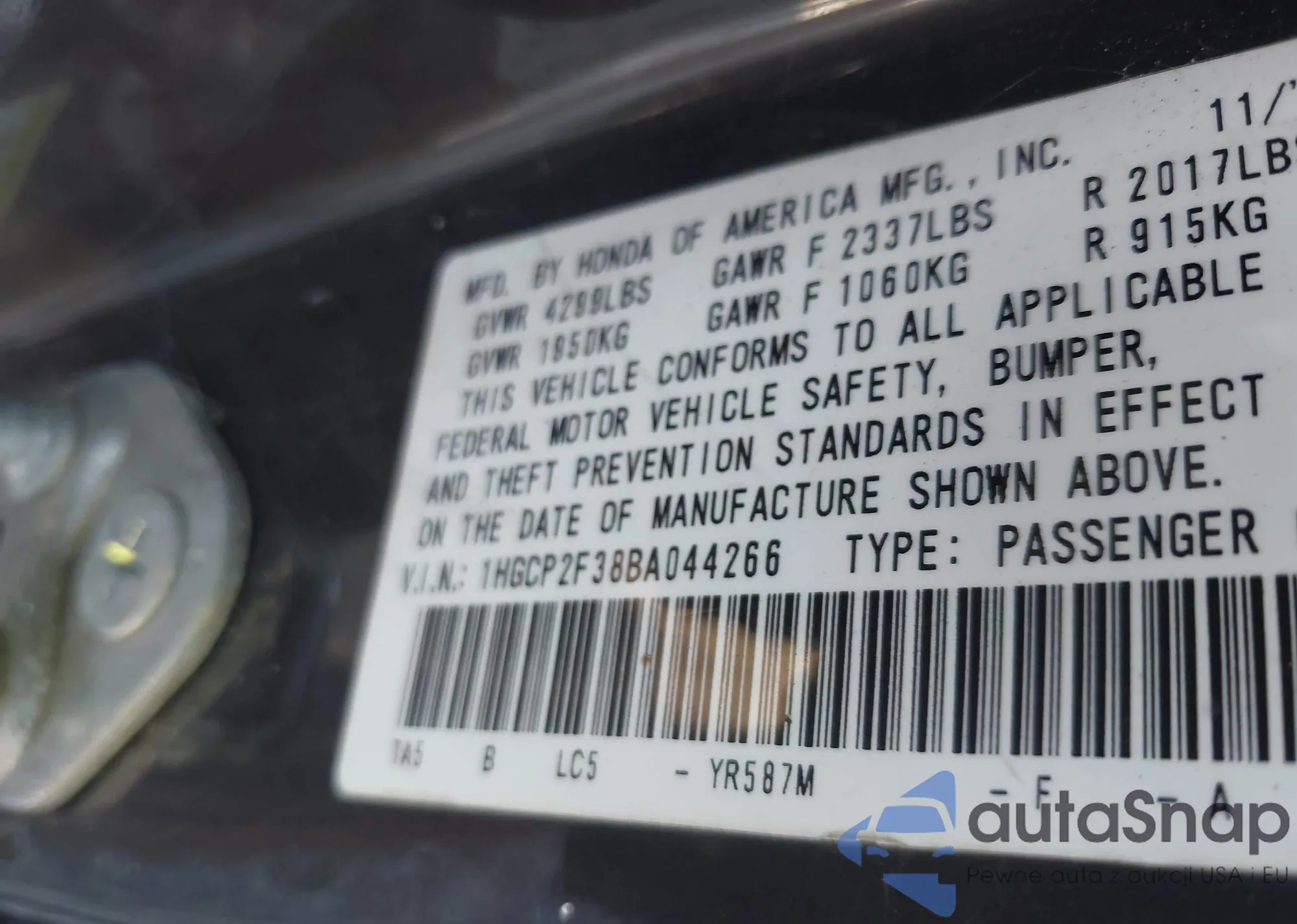 LOT: 43742201 VIN: 1HGCP2F38BA044266