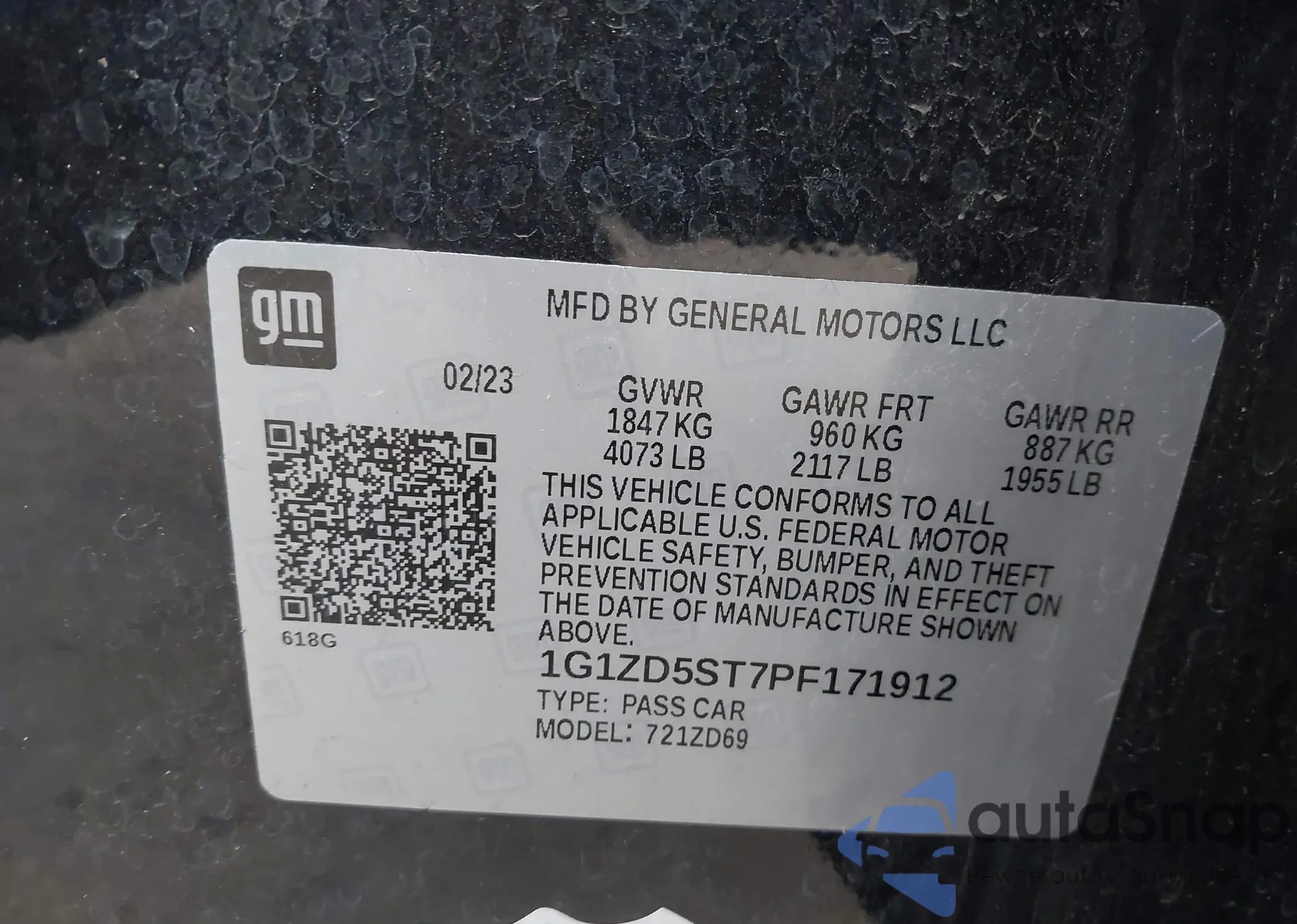 • VIN 1G1ZD5ST7PF171912