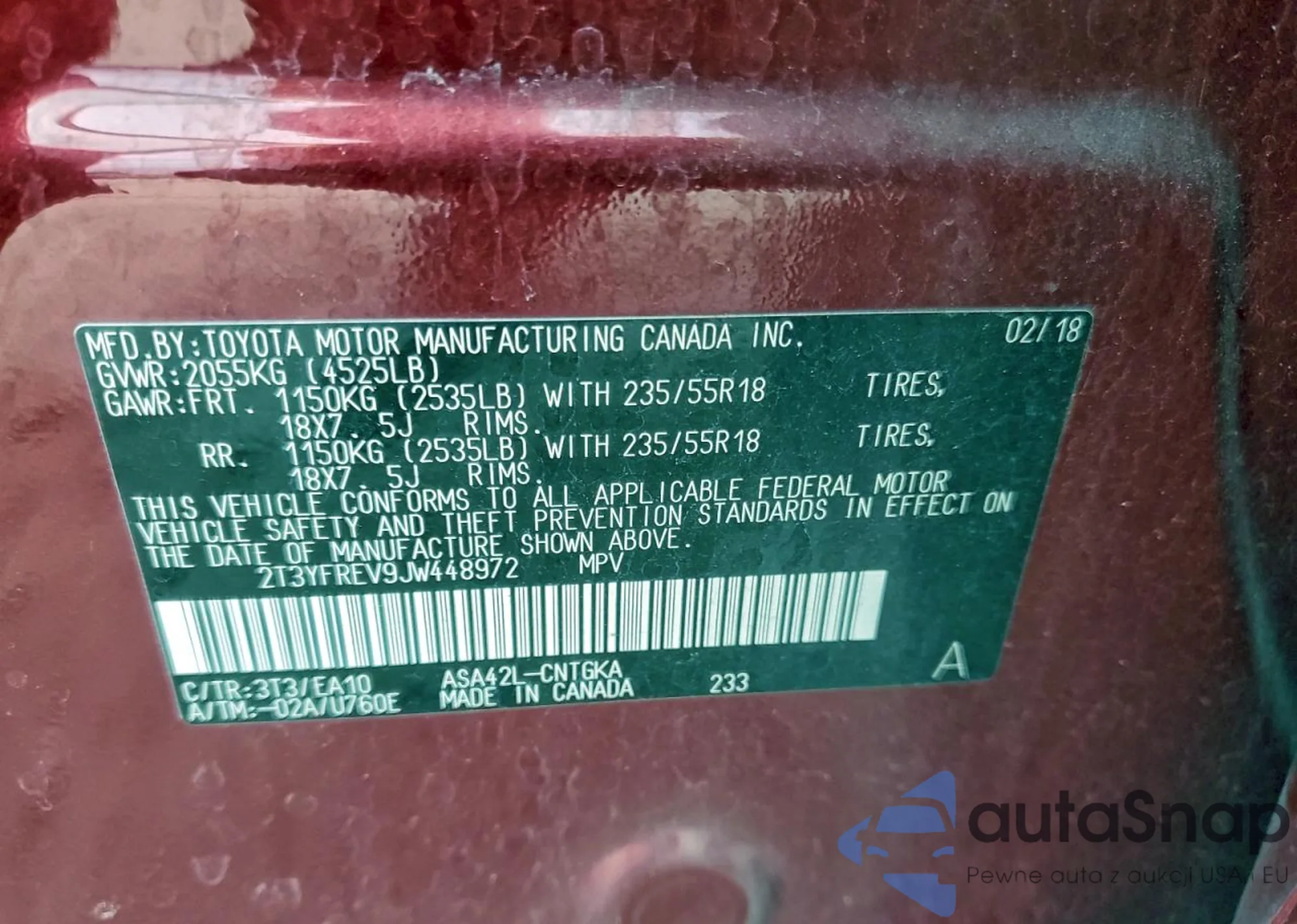 LOT: 94741285 VIN: 2T3YFREV9JW448972