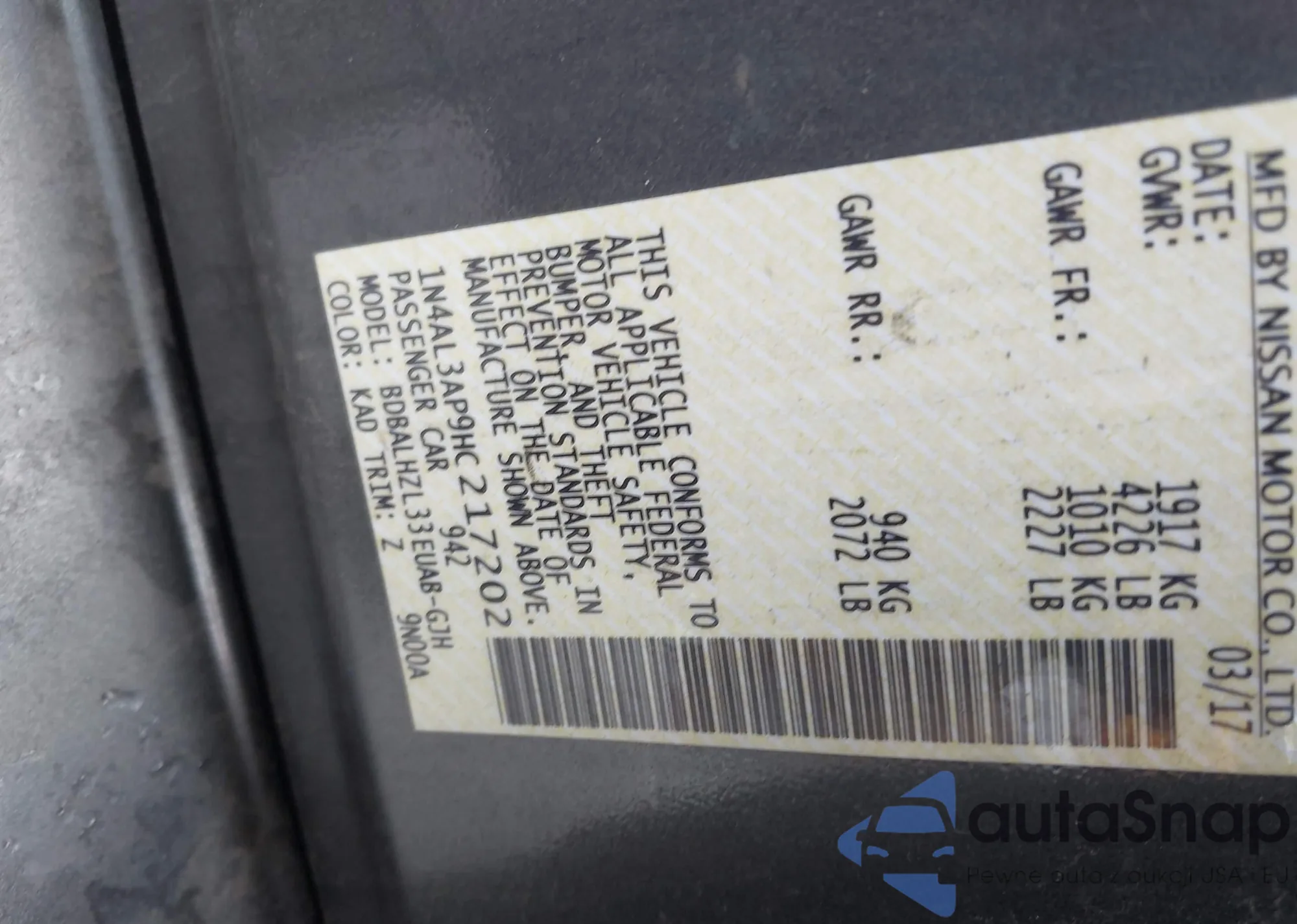 • VIN 1N4AL3AP9HC217202