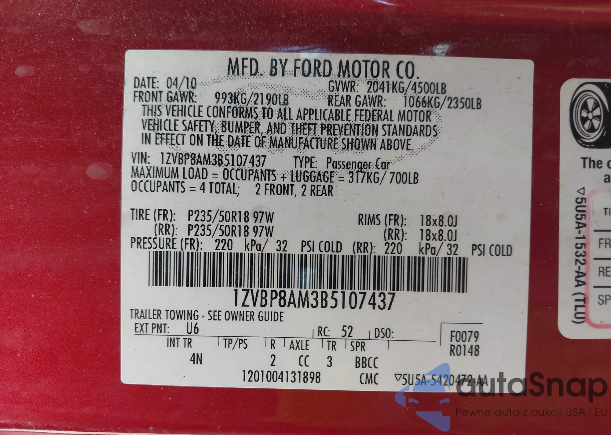 • VIN 1ZVBP8AM3B5107437