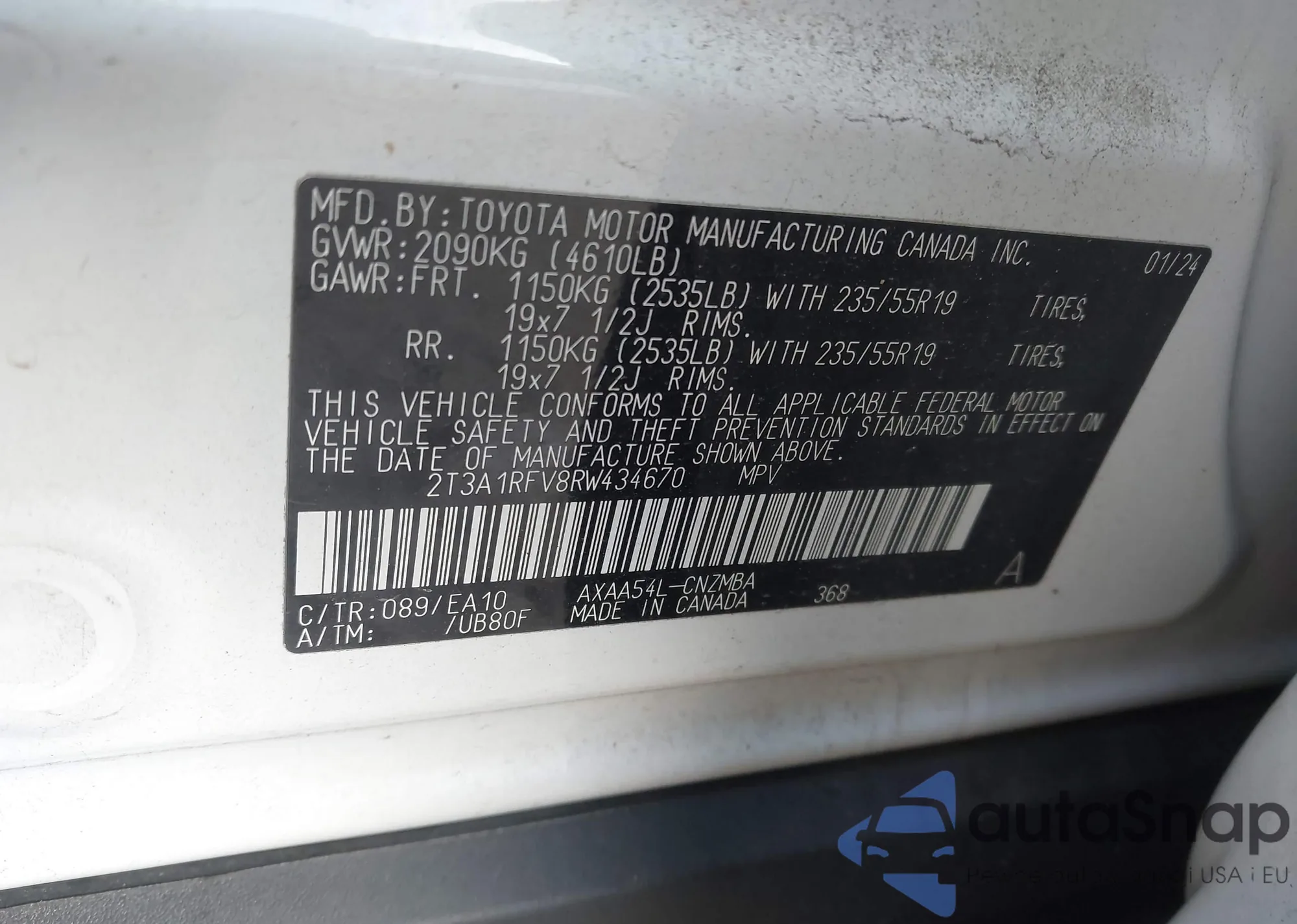 • VIN 2T3A1RFV8RW434670