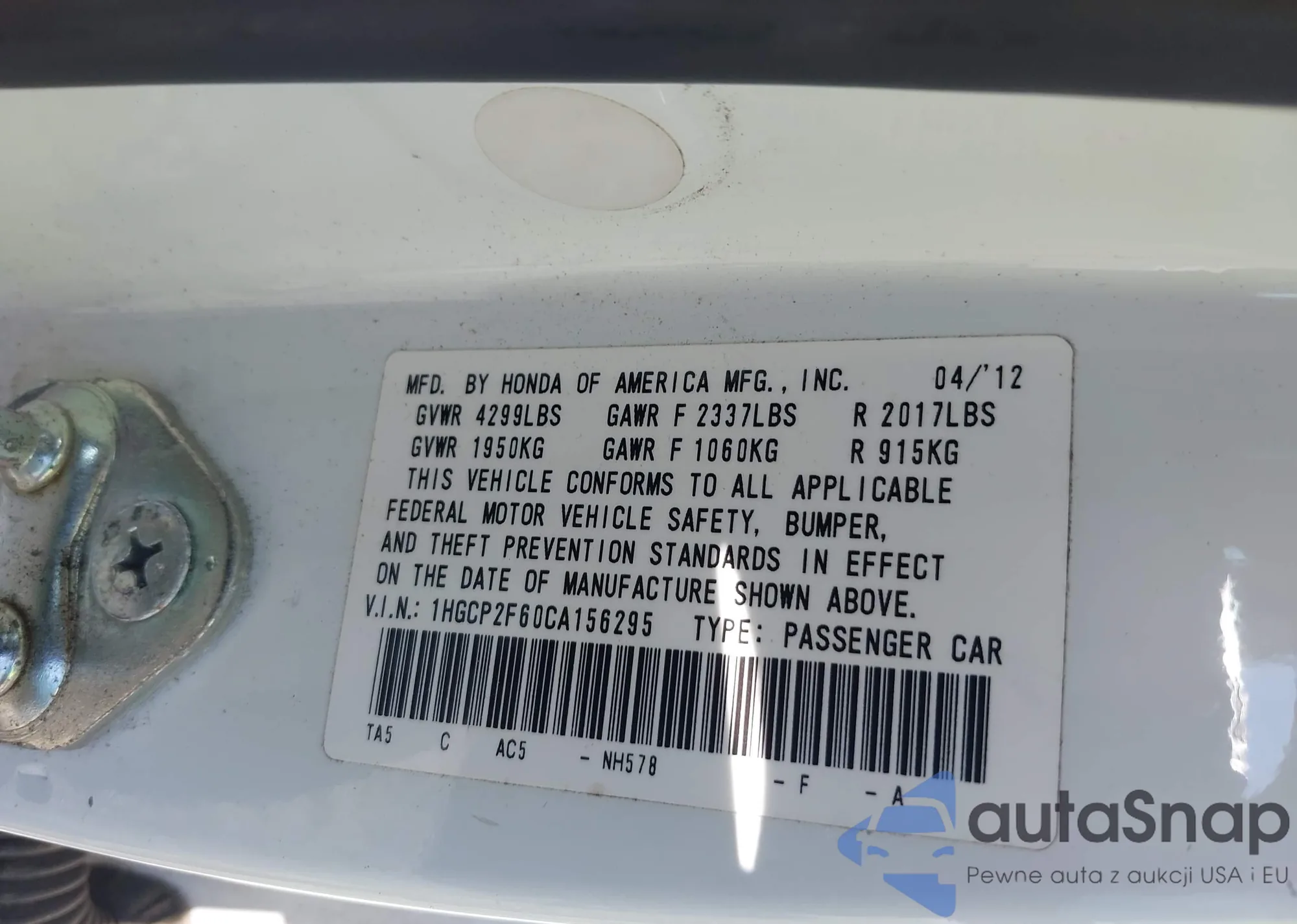LOT: 43647745 VIN: 1HGCP2F60CA156295