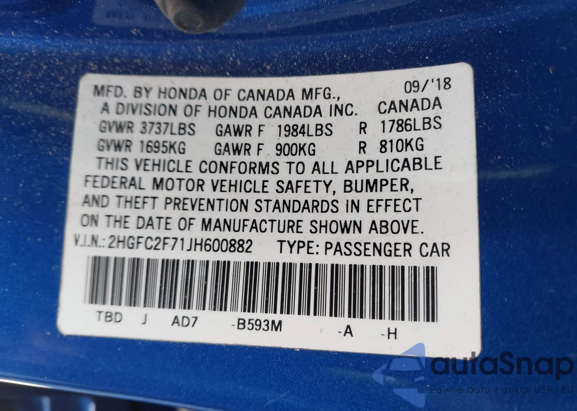 • VIN 2HGFC2F71JH600882
