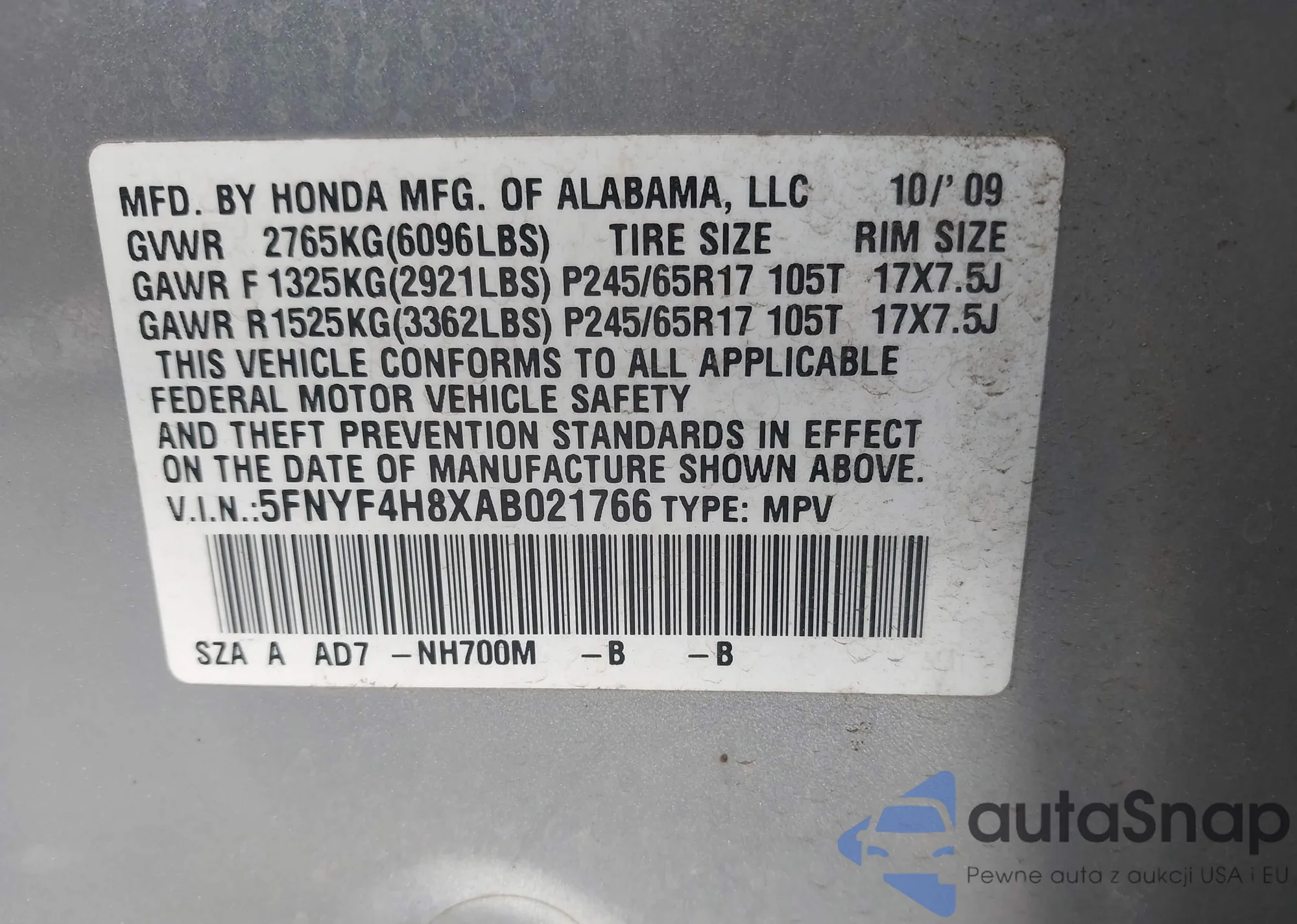 • VIN 5FNYF4H8XAB021766