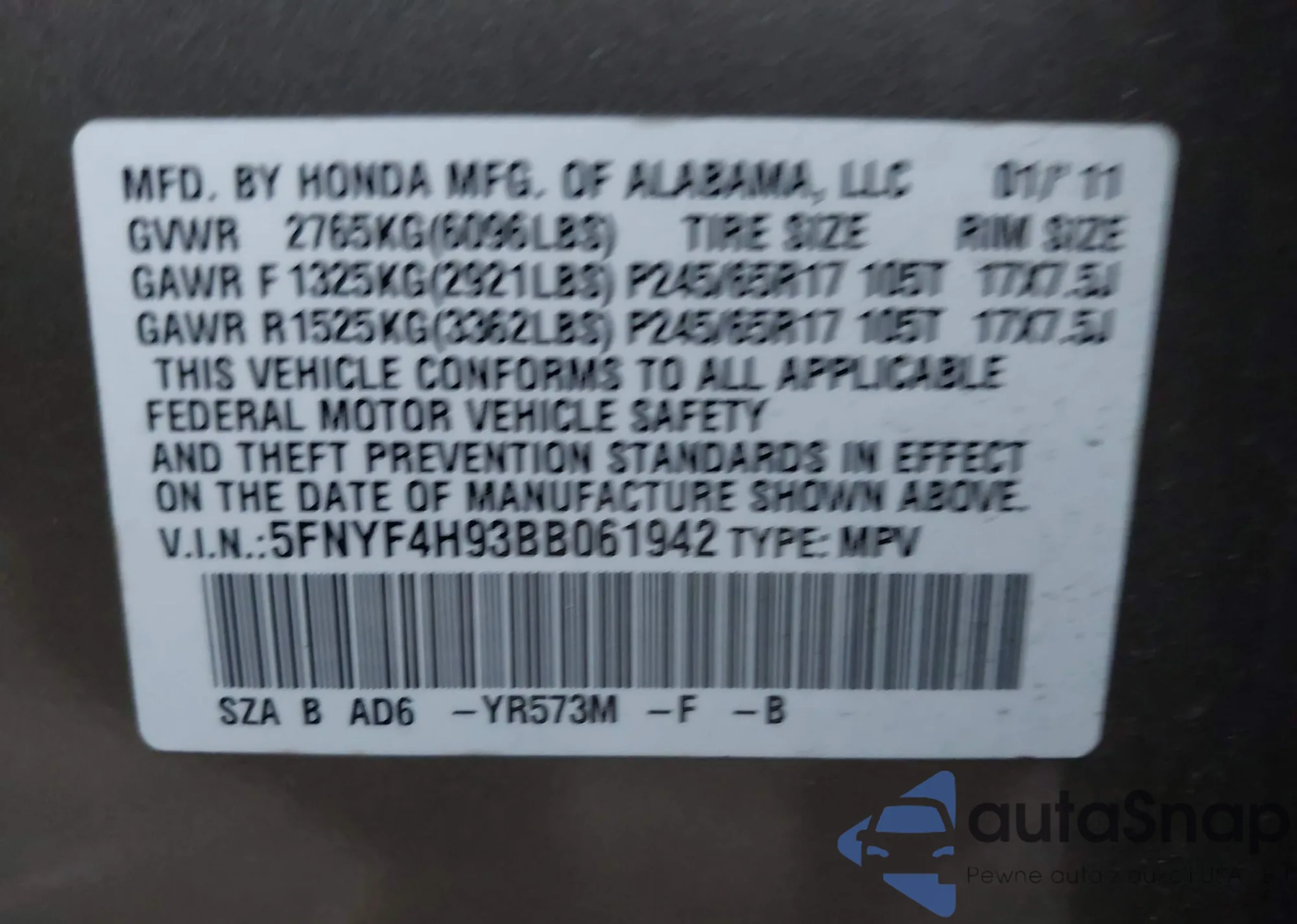 • VIN 5FNYF4H93BB061942
