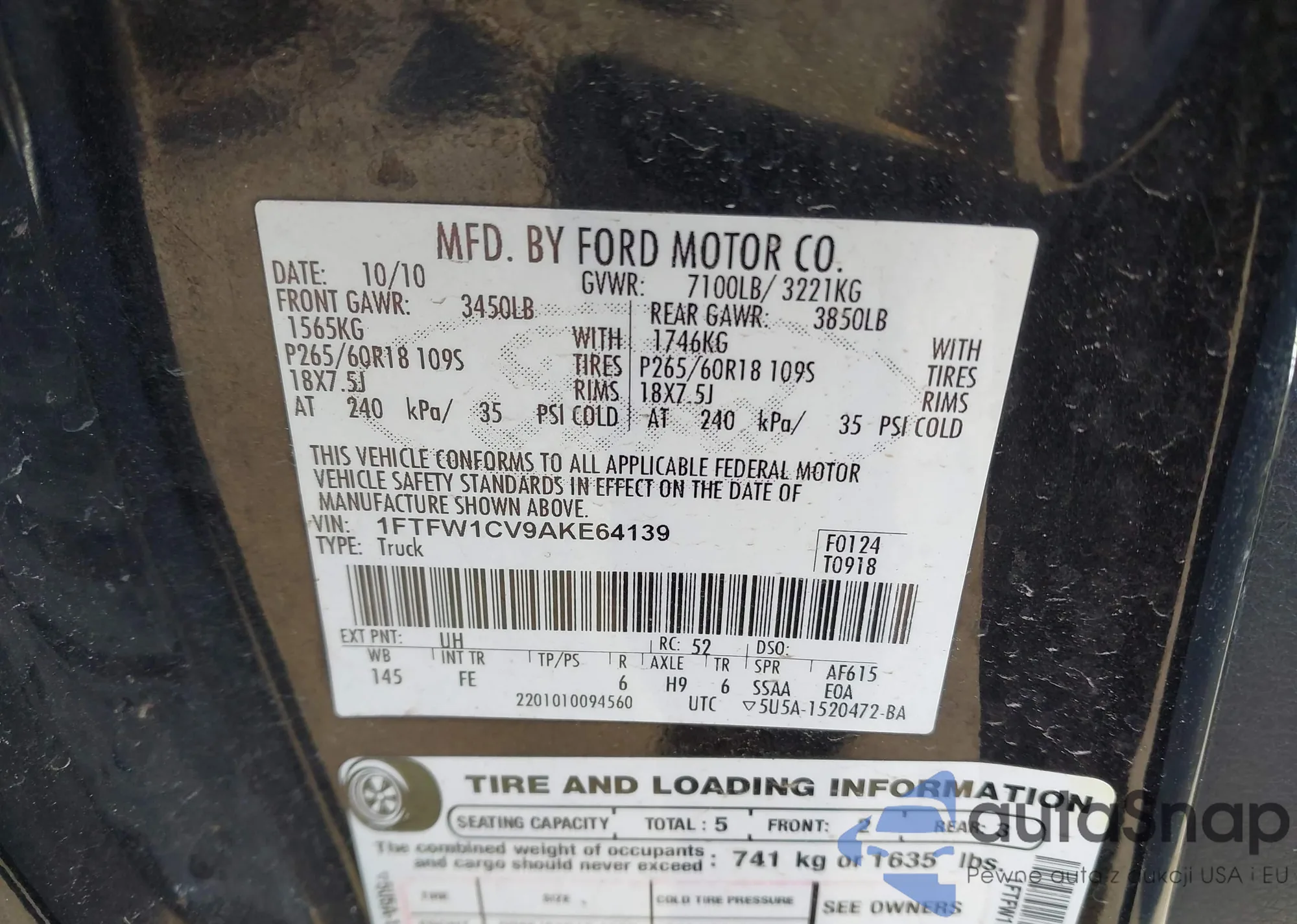 2010 Ford F-150 Fx2 Sport/Harley-Davidson/King Ranch/Lariat/Platinum/Xl/Xlt from USA, damaged, VIN 1FTFW1CV9AKE64139