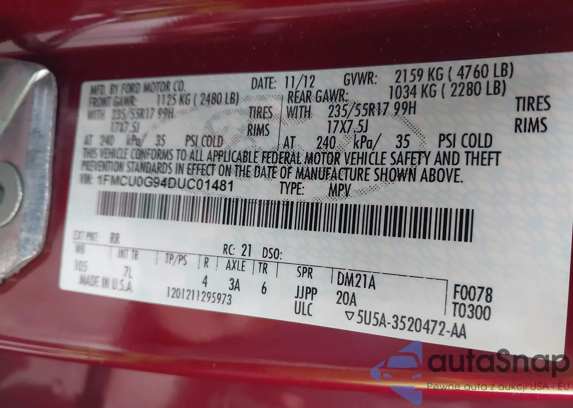 • VIN 1FMCU0G94DUC01481
