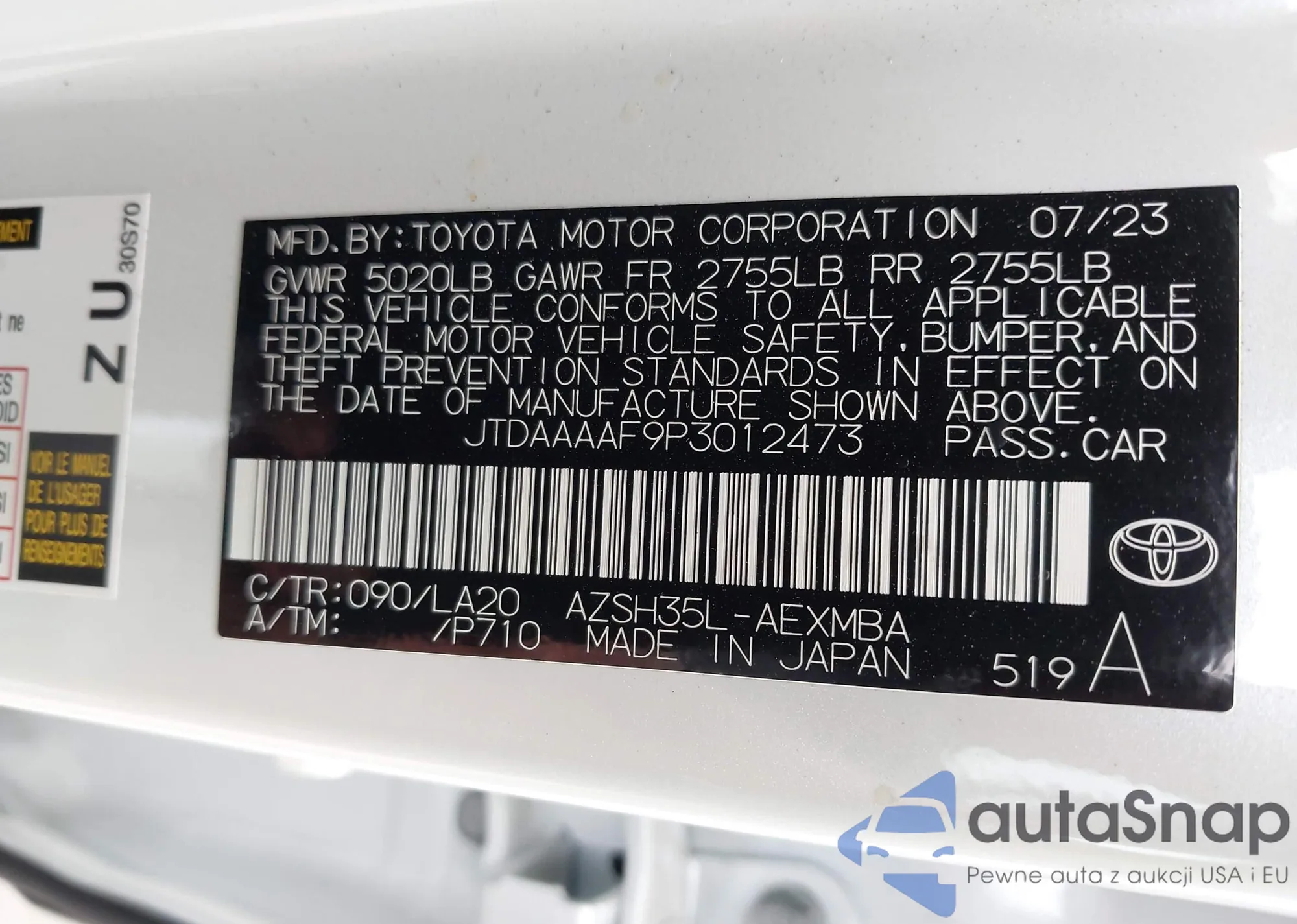 LOT: 43412592 VIN: JTDAAAAF9P3012473