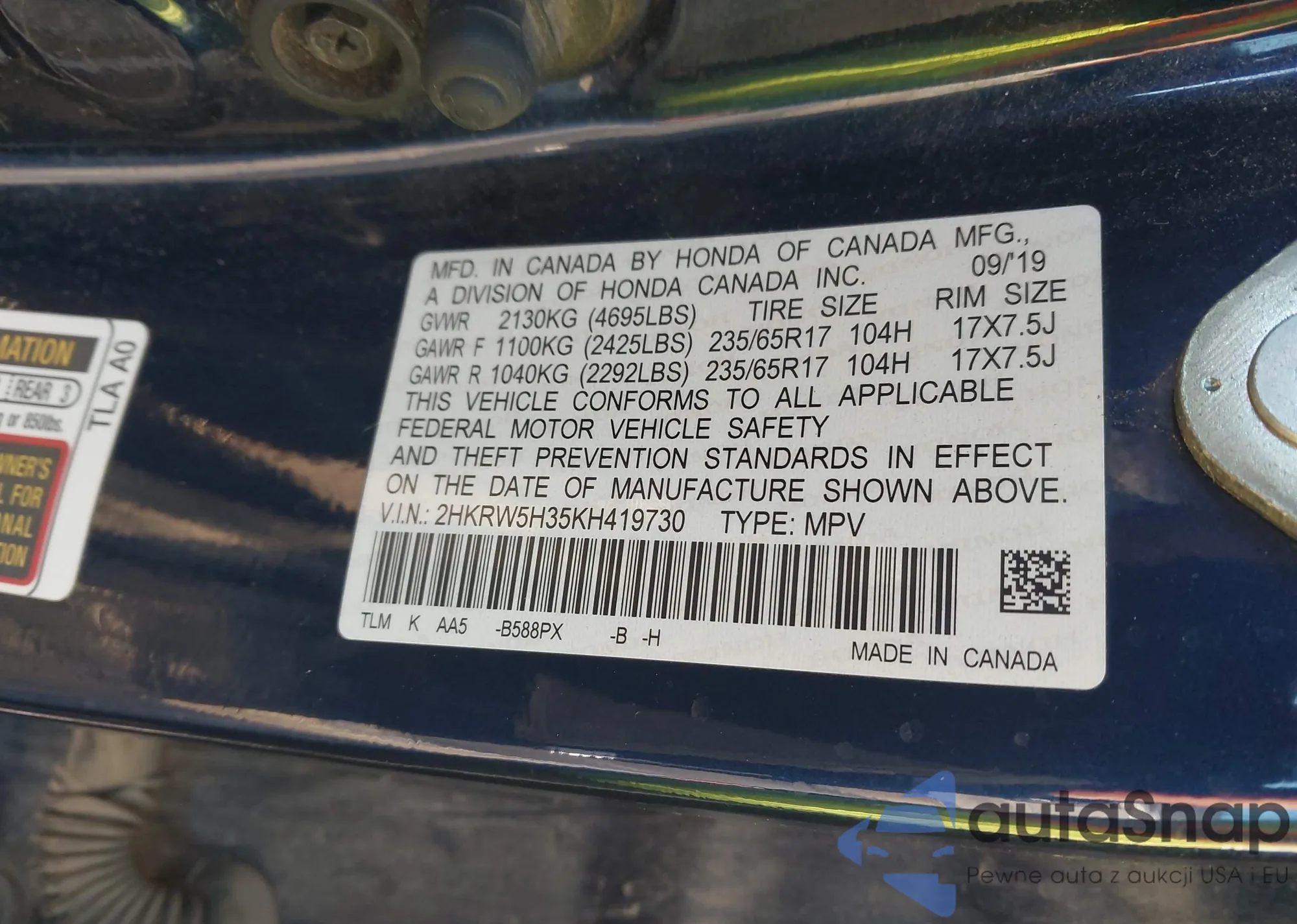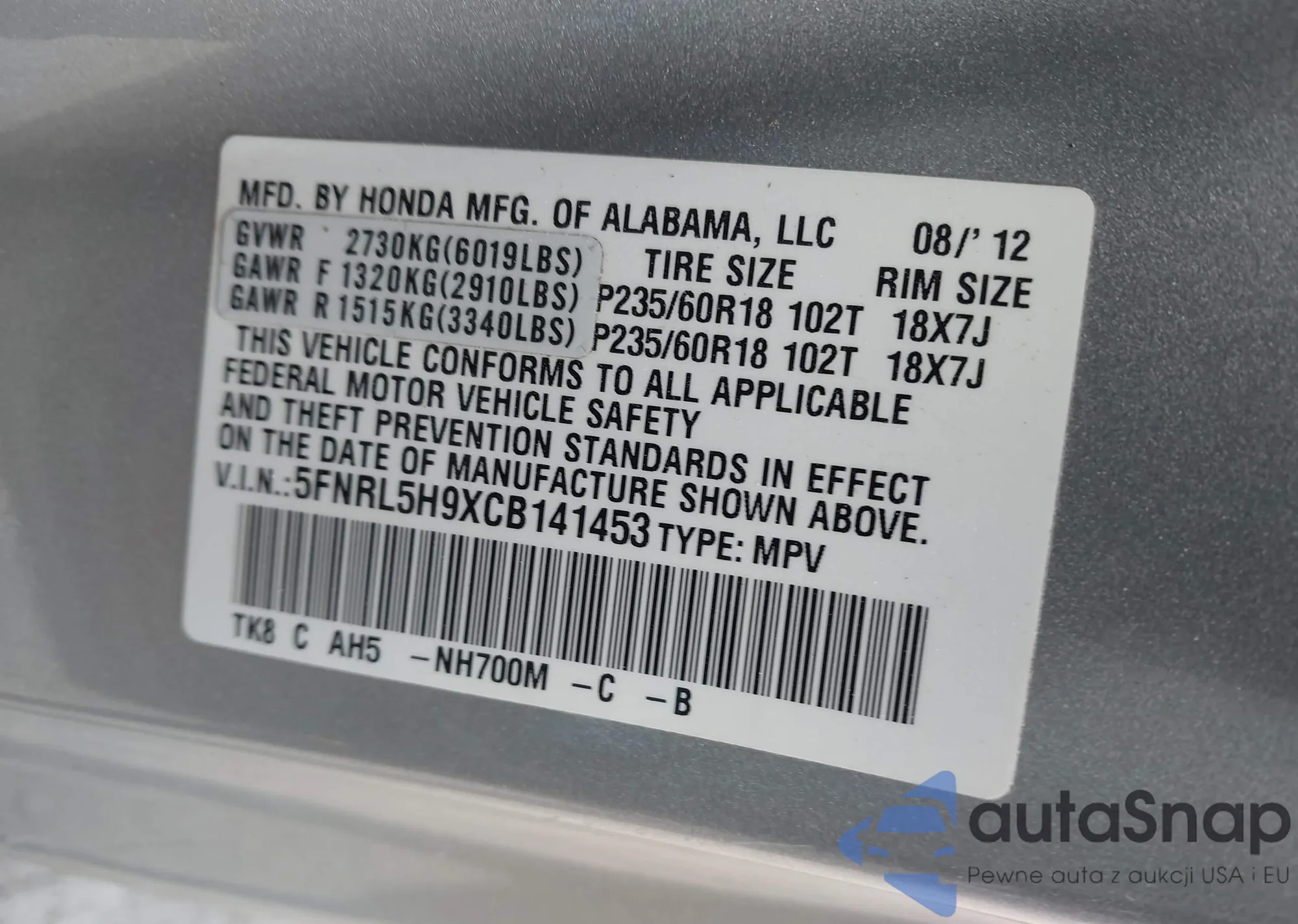 • VIN 5FNRL5H9XCB141453