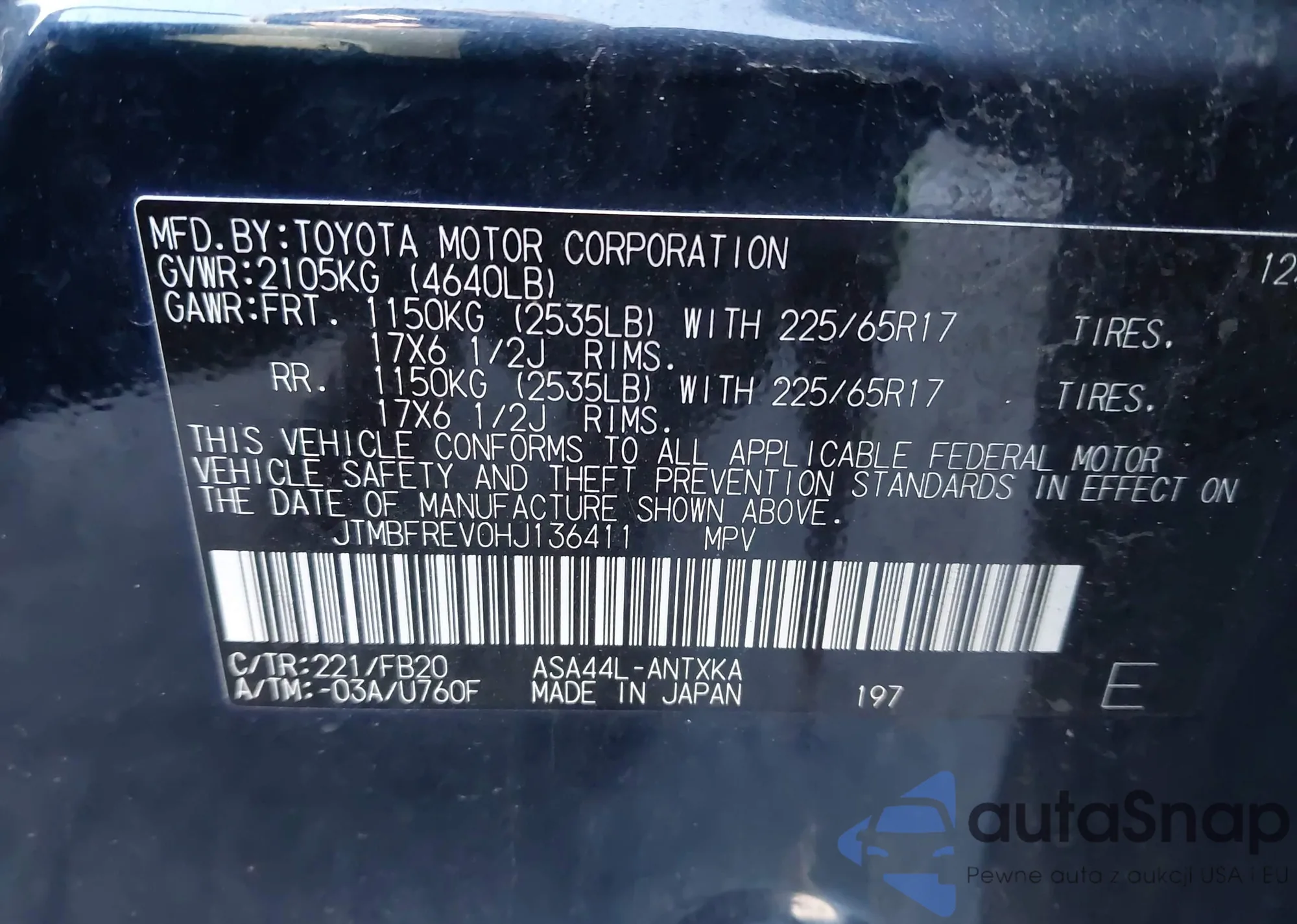 LOT: 43882299 VIN: JTMBFREV0HJ136411