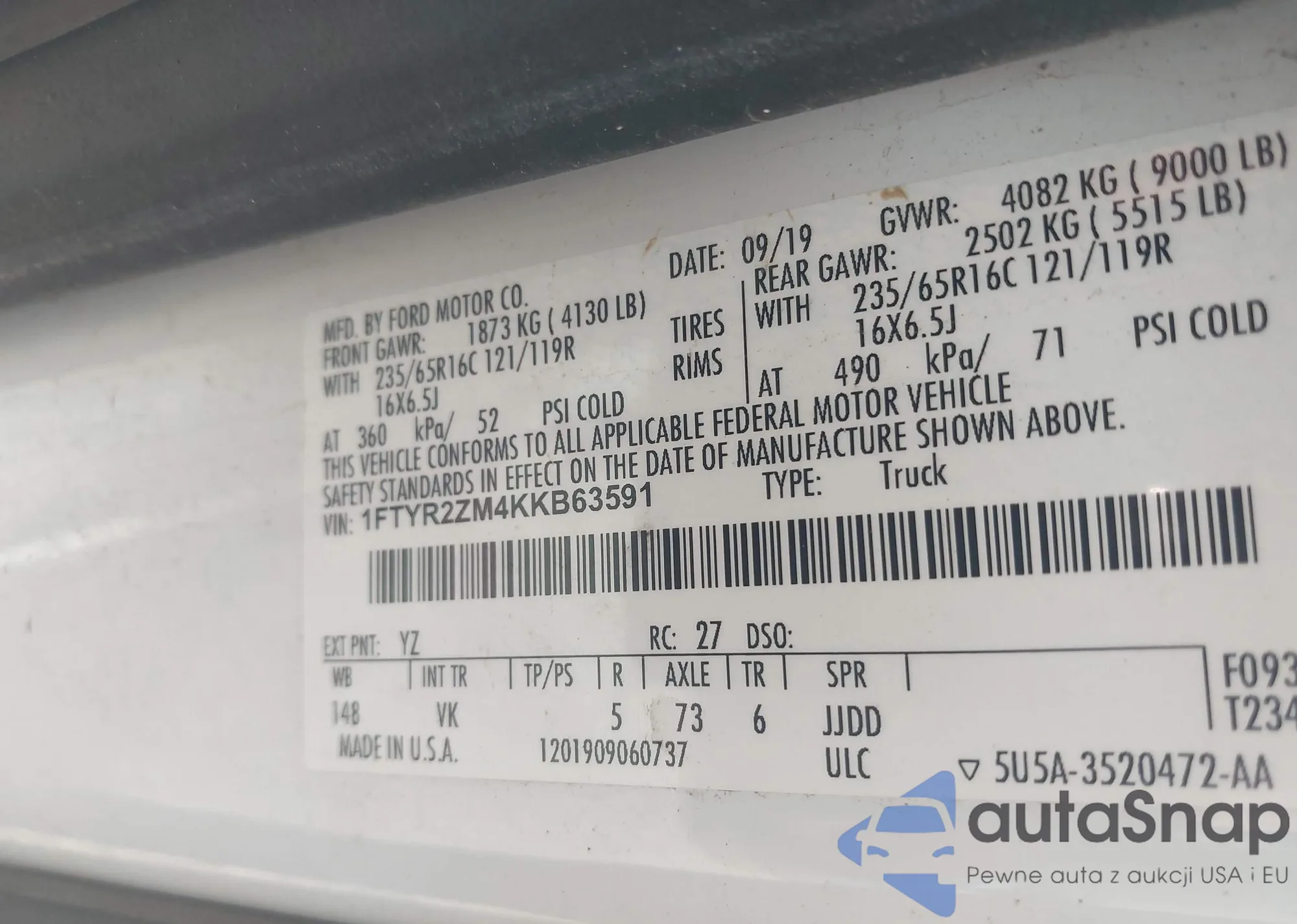 • VIN 1FTYR2ZM4KKB63591