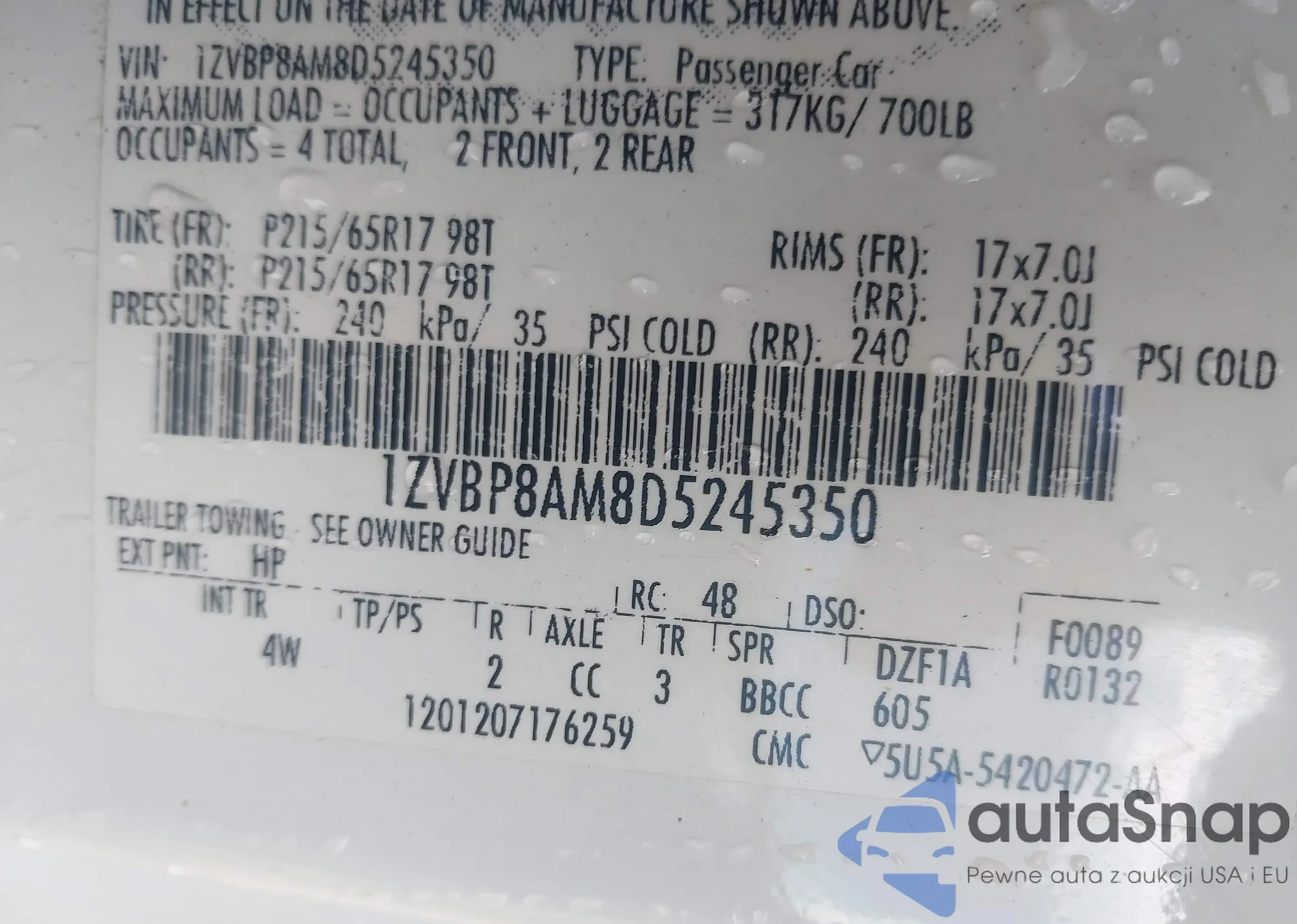 LOT: 43264036 VIN: 1ZVBP8AM8D5245350