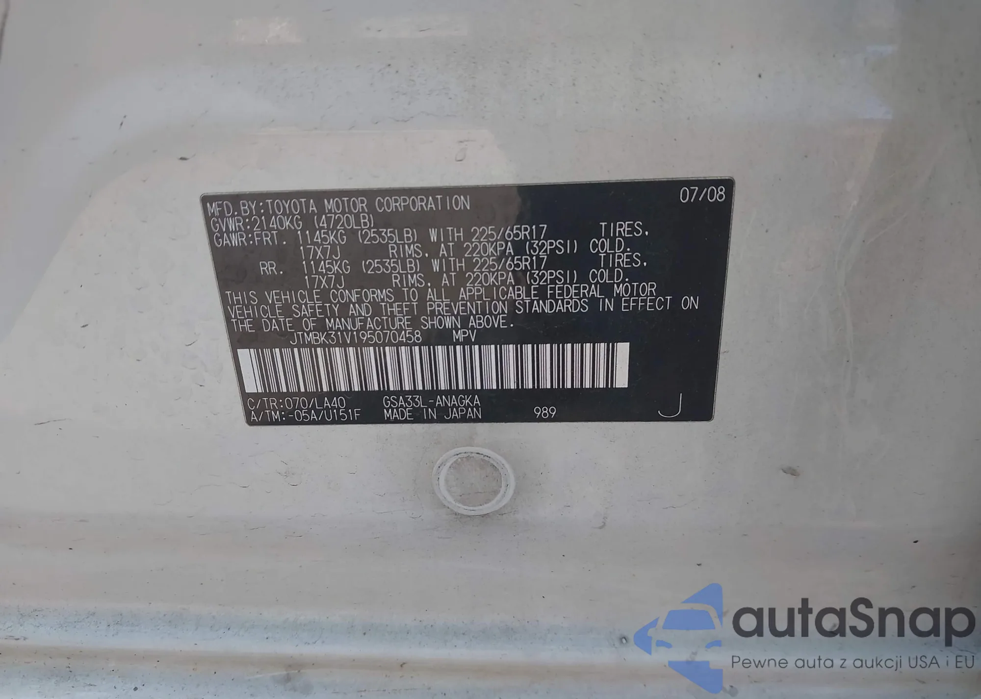 LOT: 43313229 VIN: JTMBK31V195070458