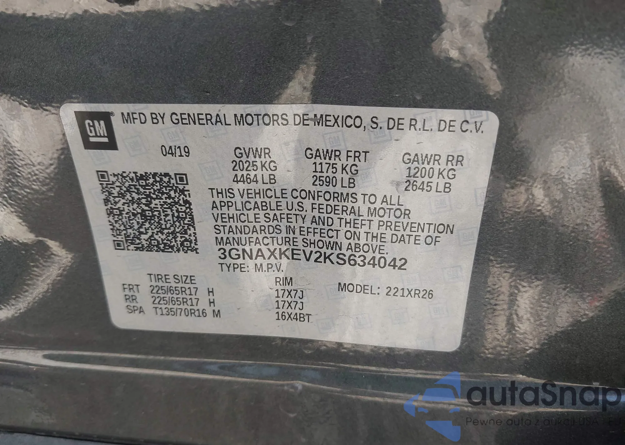LOT: 43458416 VIN: 3GNAXKEV2KS634042
