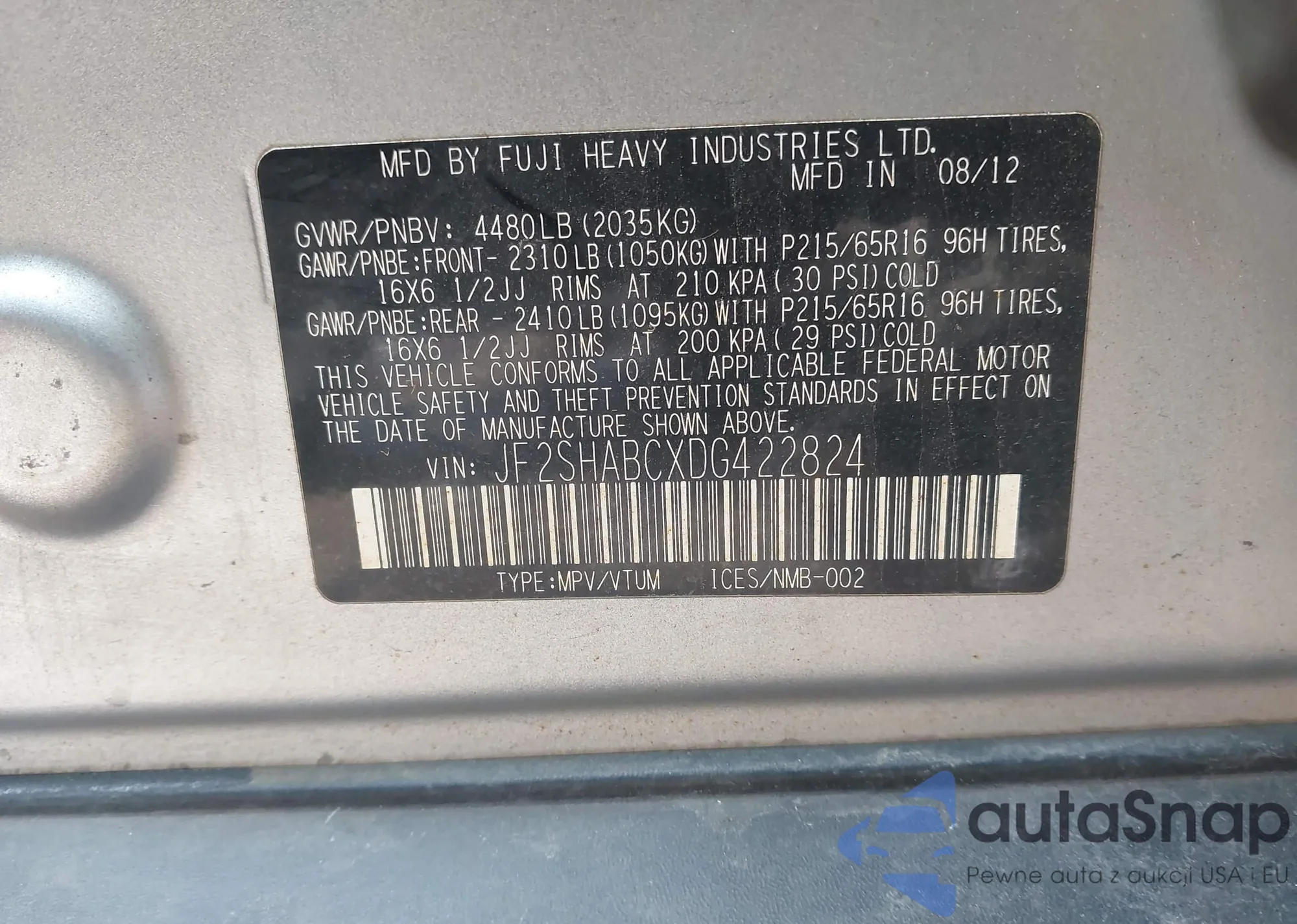 LOT: 43808005 VIN: JF2SHABCXDG422824