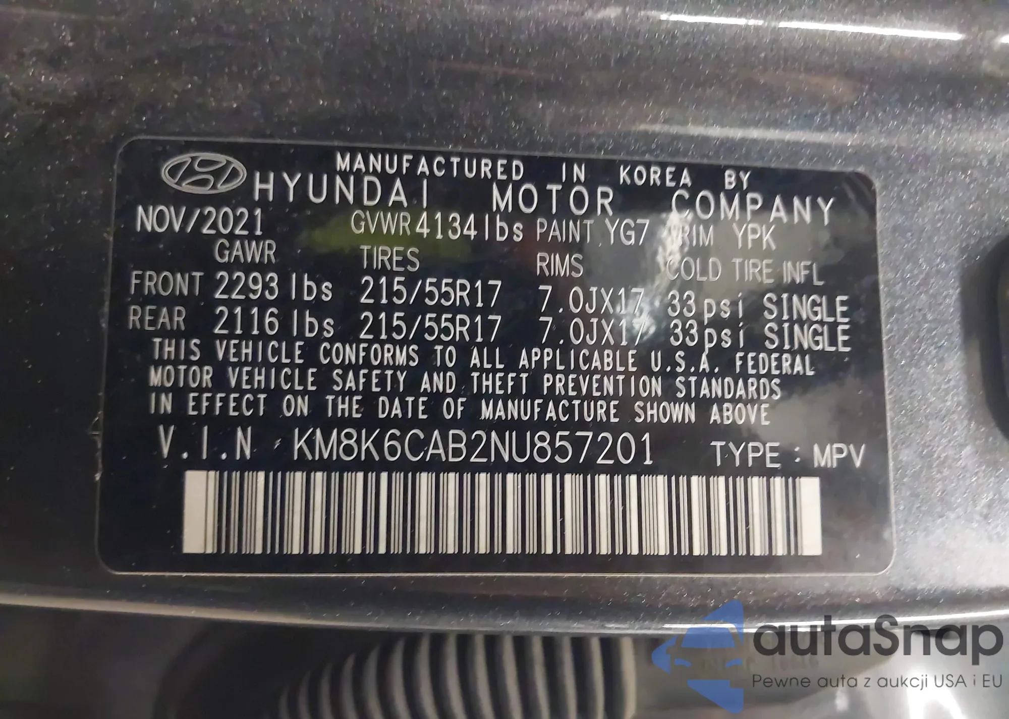 • VIN KM8K6CAB2NU857201
