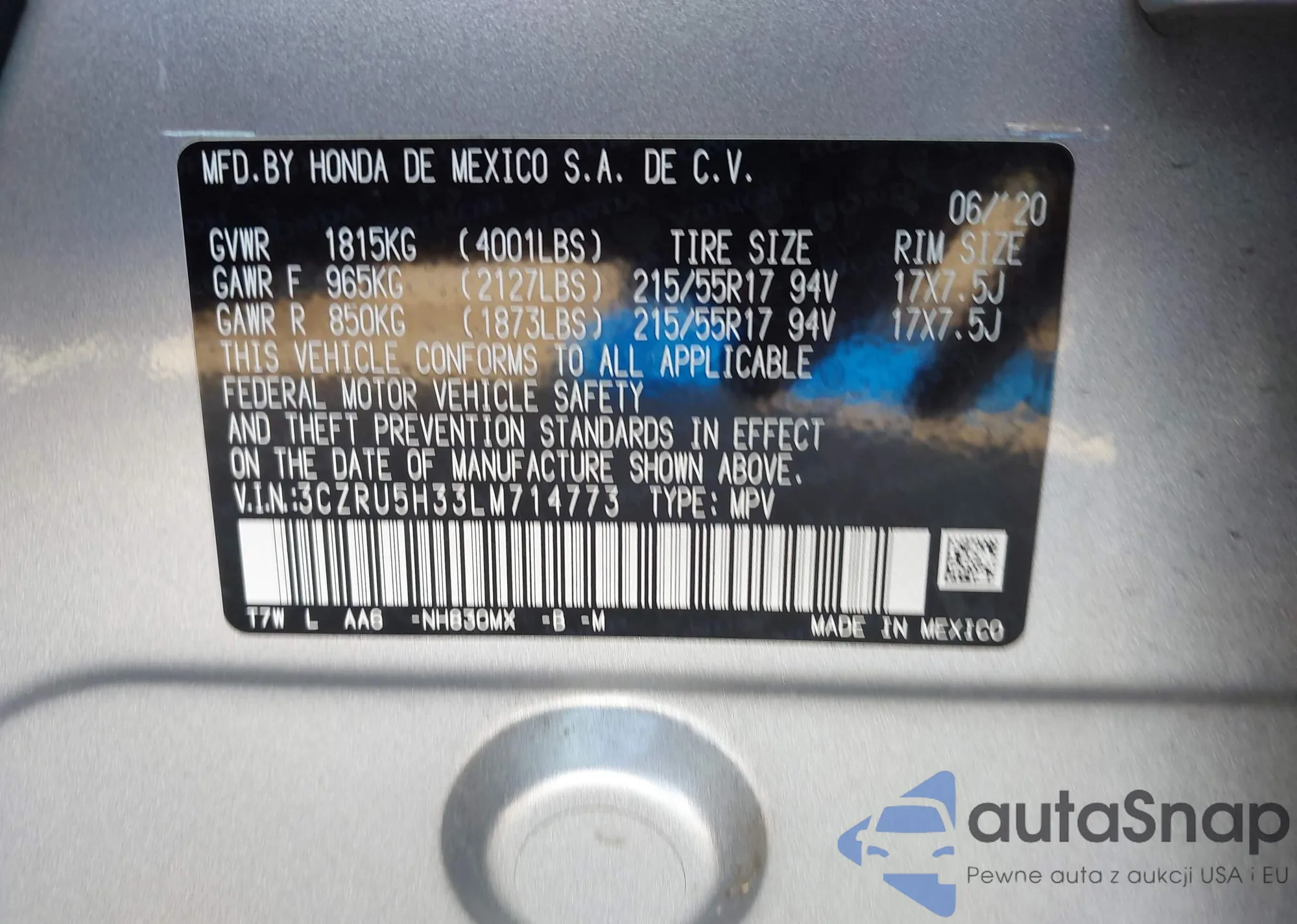 LOT: 43464743 VIN: 3CZRU5H33LM714773