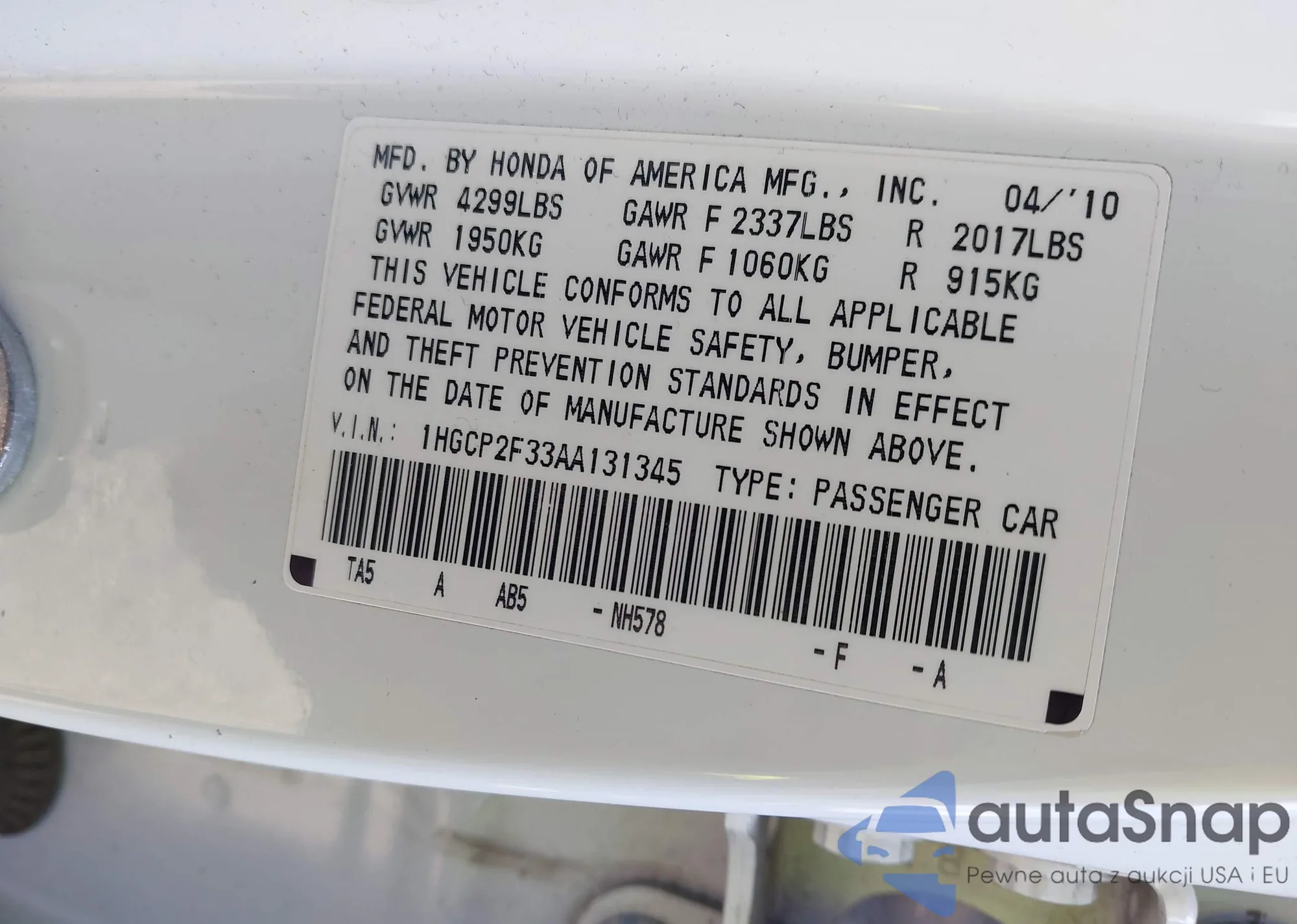 LOT: 43500630 VIN: 1HGCP2F33AA131345
