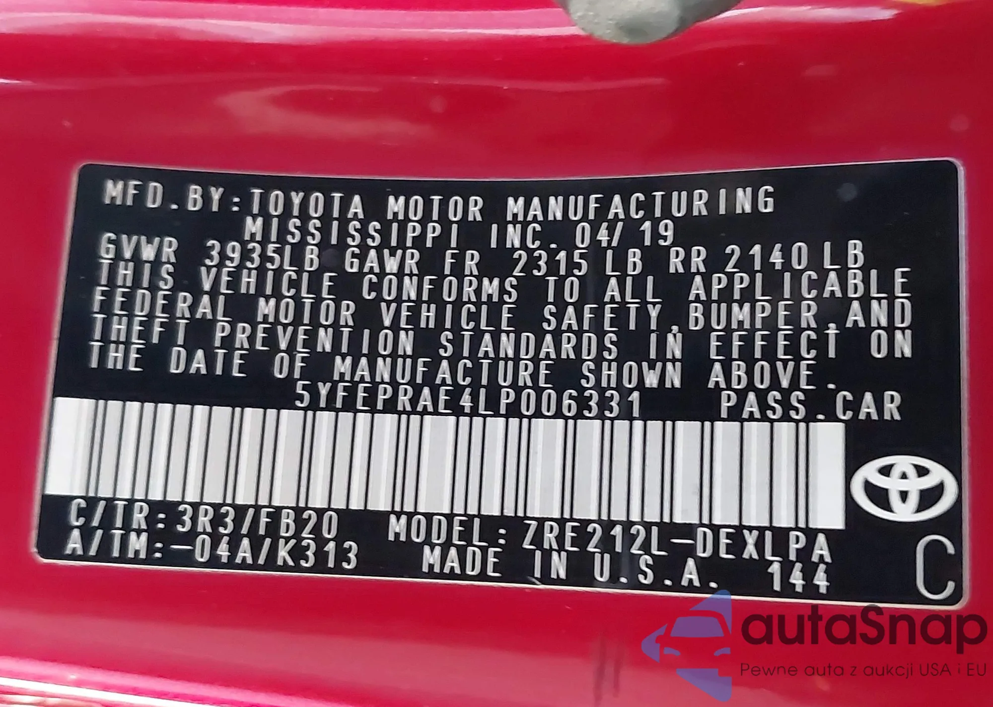• VIN 5YFB4MDE5RP114041