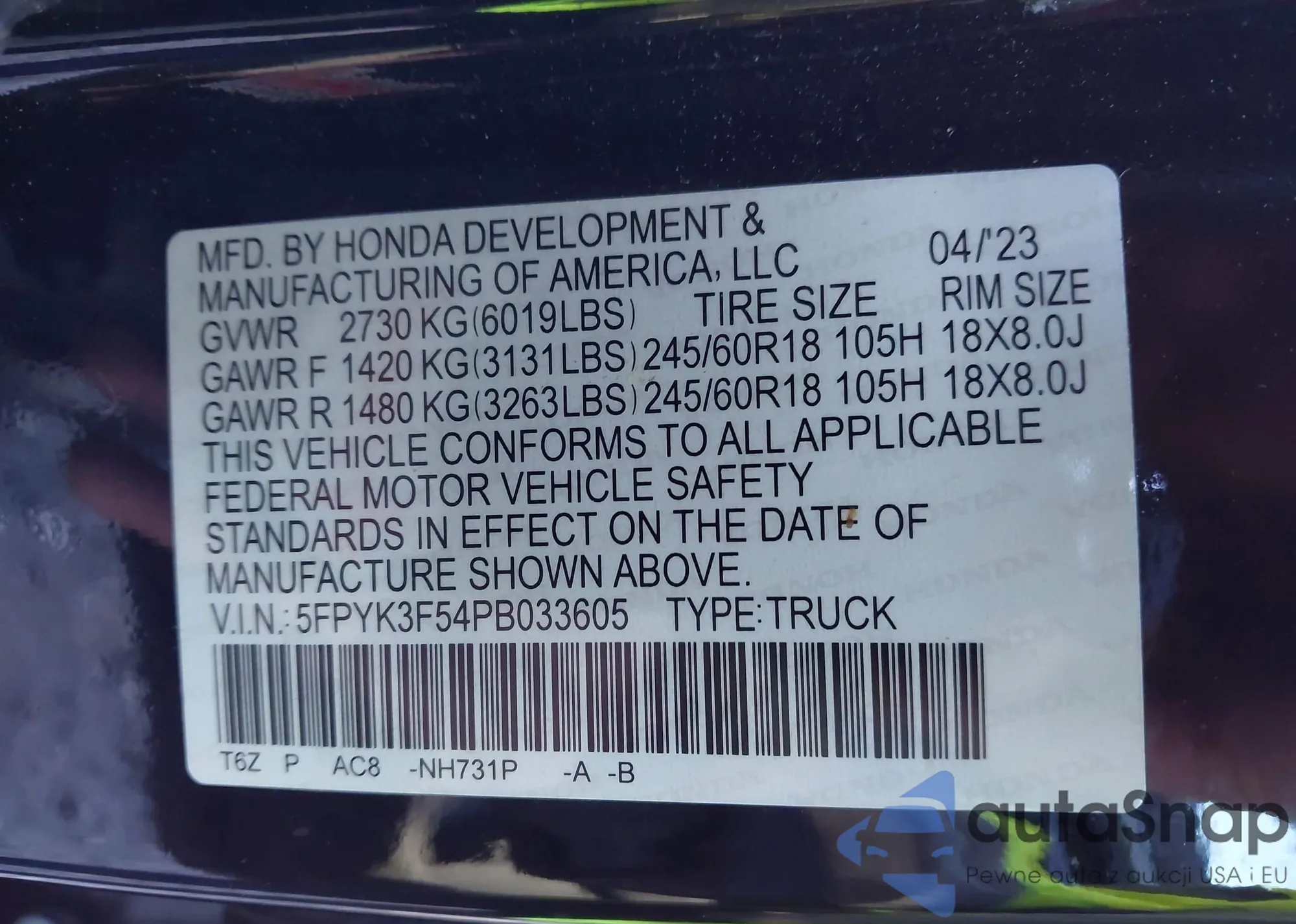 • VIN 5FPYK3F54PB033605