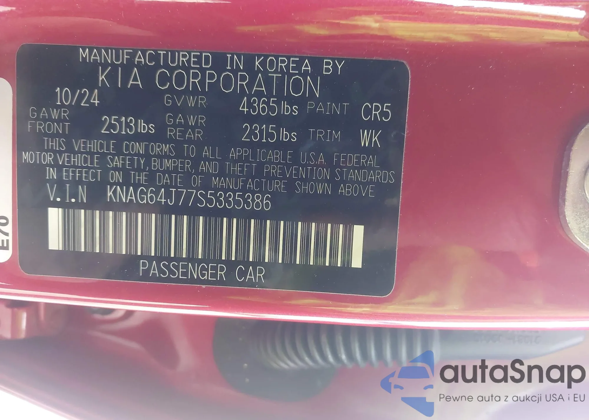 • VIN KNAG64J77S5335386