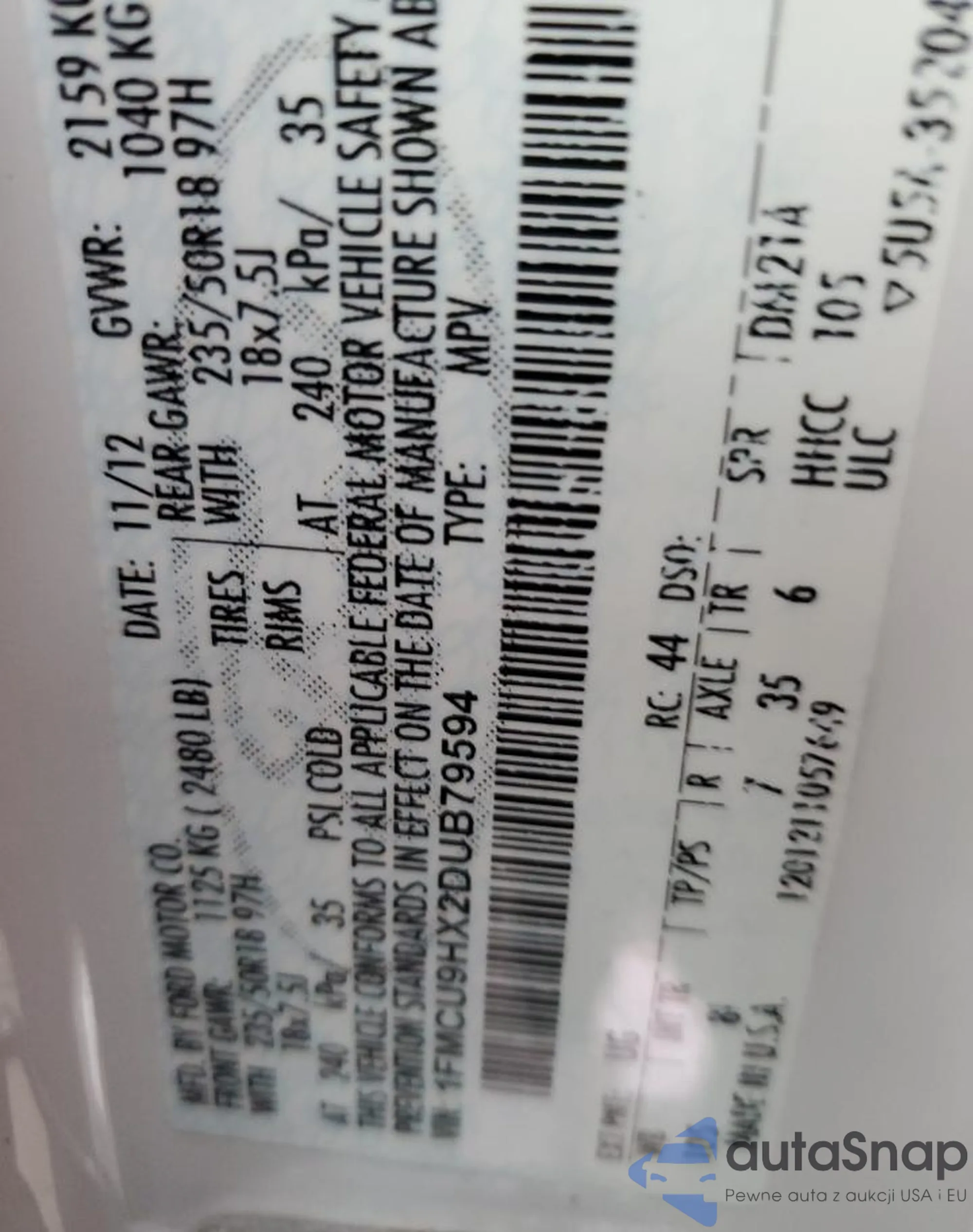• VIN 1FMCU9HX2DUB79594