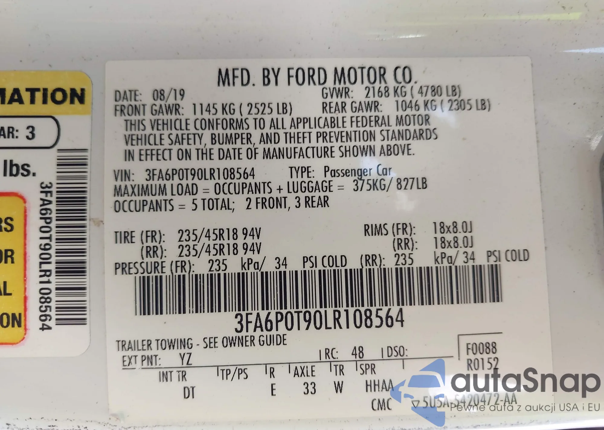 LOT: 43366801 VIN: 3FA6P0T90LR108564