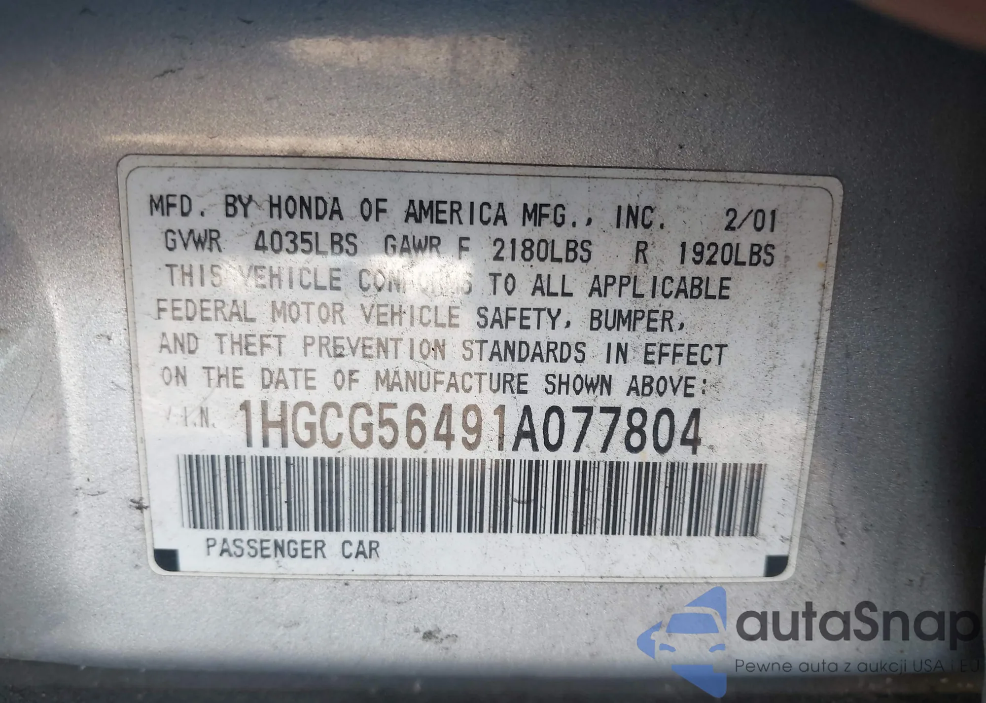 LOT: 43552137 VIN: 1HGCG56491A077804