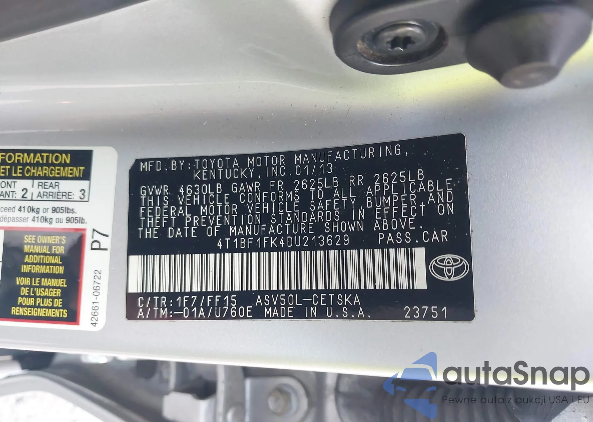 • VIN 4T1BF1FK4DU213629