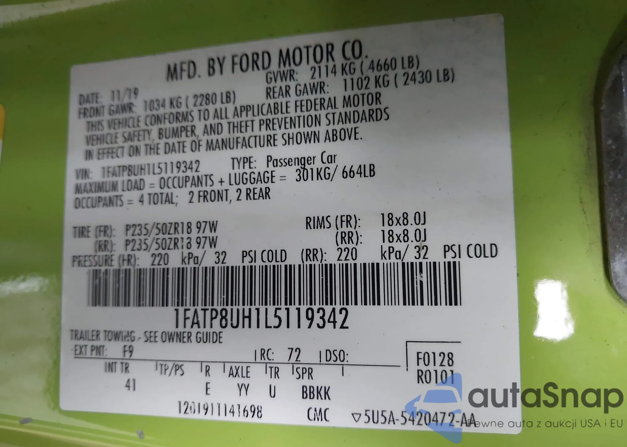 LOT: 43324500 VIN: 1FATP8UH1L5119342