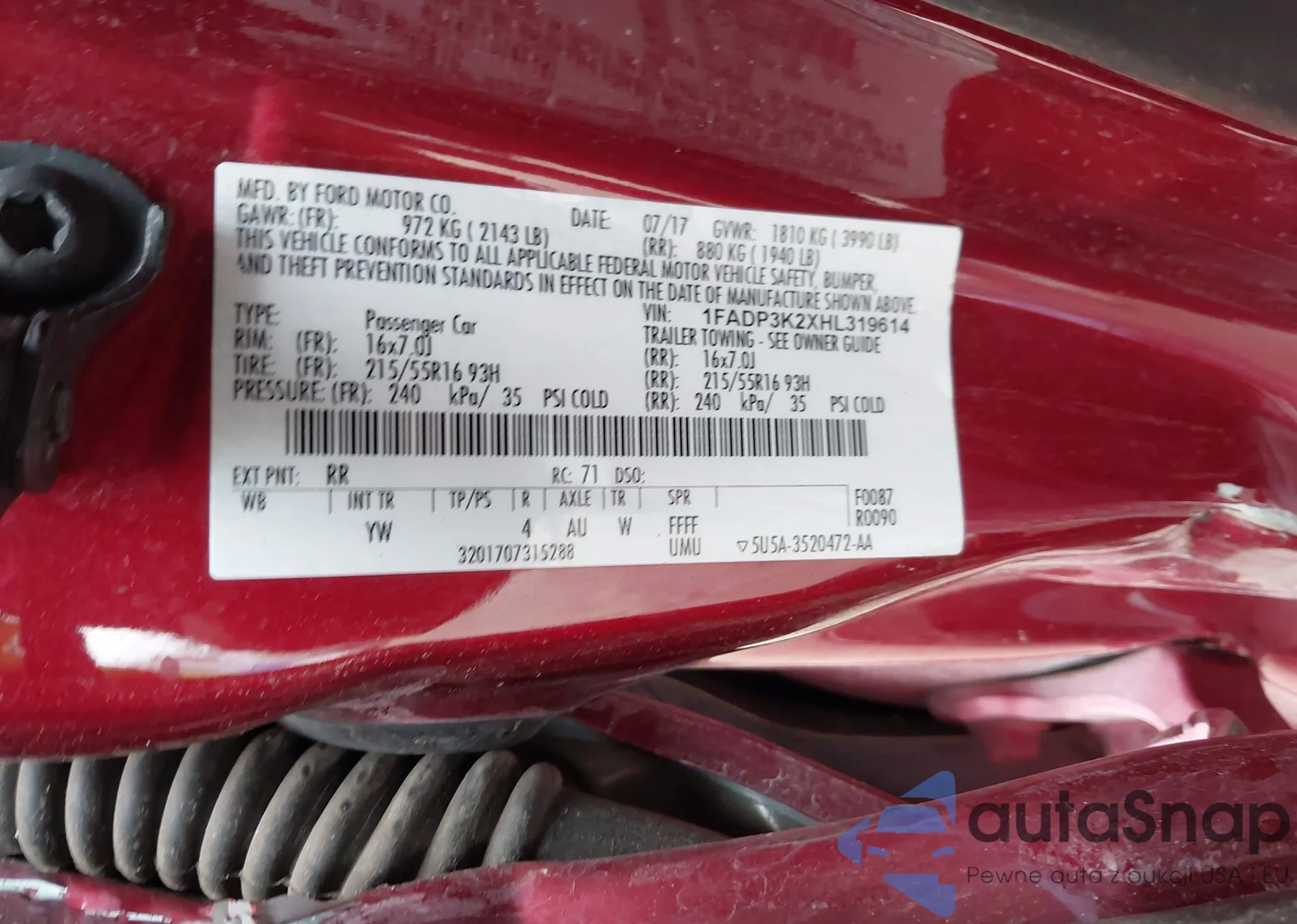LOT: 43850262 VIN: 1FADP3K2XHL319614