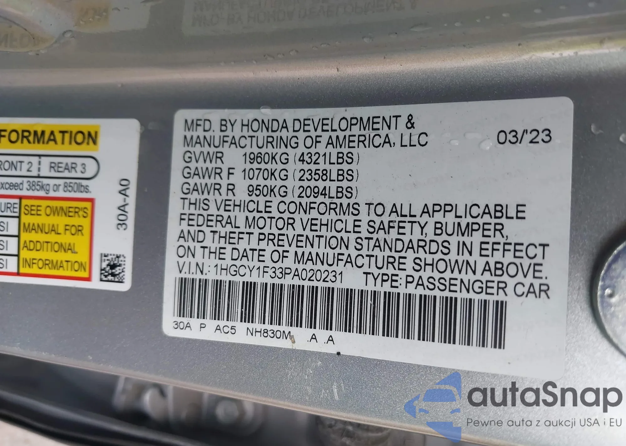 LOT: 43442557 VIN: 1HGCY1F33PA020231
